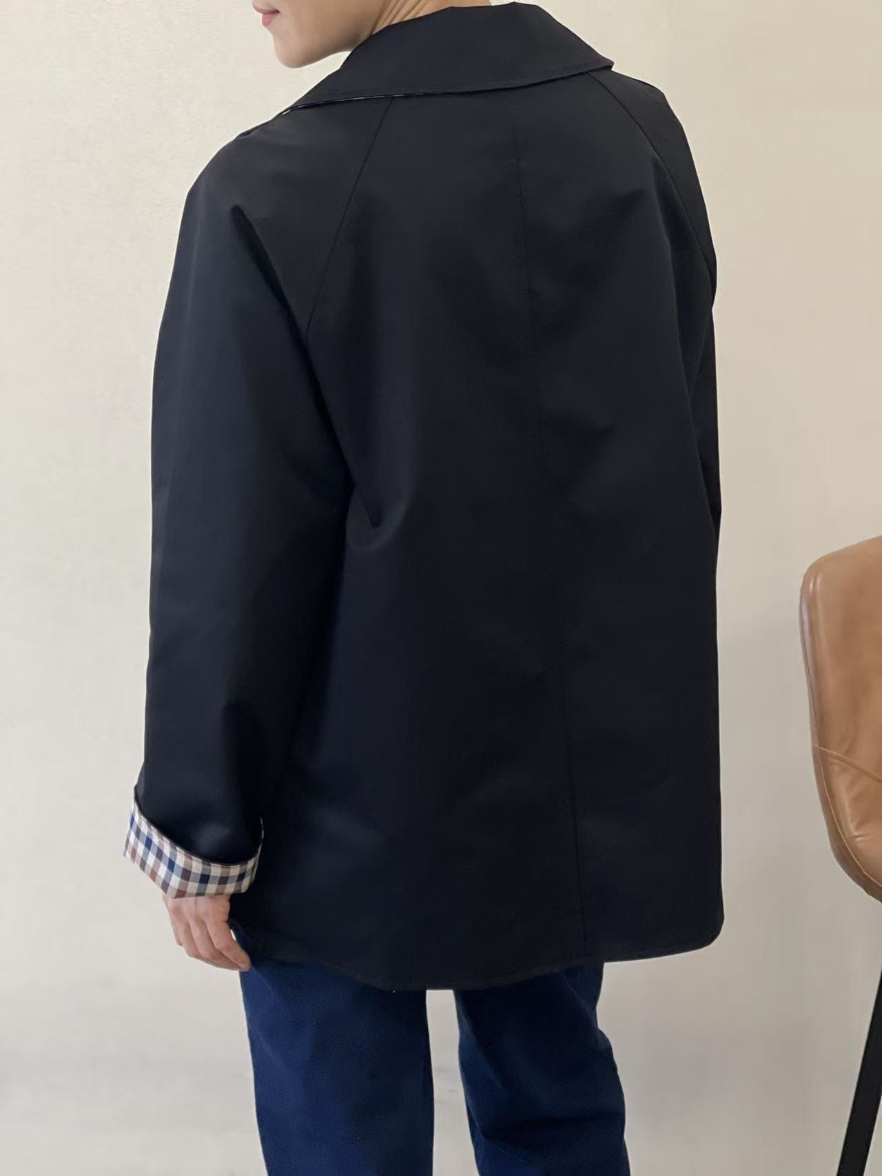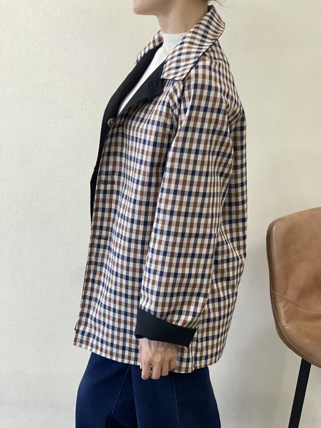 Gabardina negra reversible Morin con cuello en el mismo tono, botonera en marrón claro oscuro y bolsillos en diagonal en el lado negro. Parte reversible a cuadros marrones y azules, sin bolsillos y con cuello del mismo estampado.