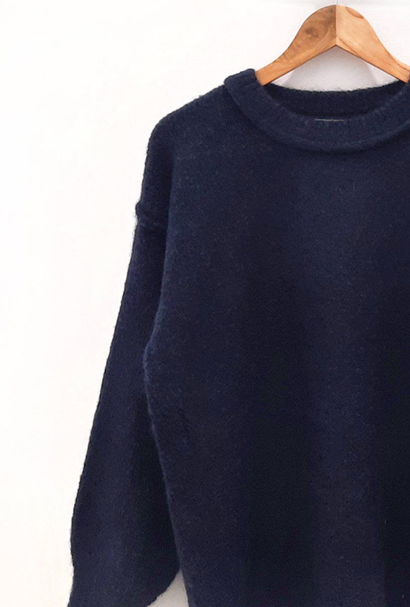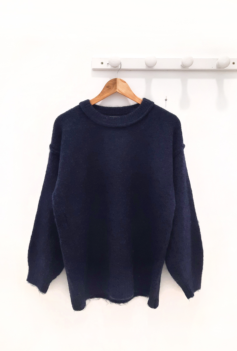 Jersey azul marino Axel de punto con cuello redondo y costuras gruesas en los hombros, uniones de manga con hombro y cuello.