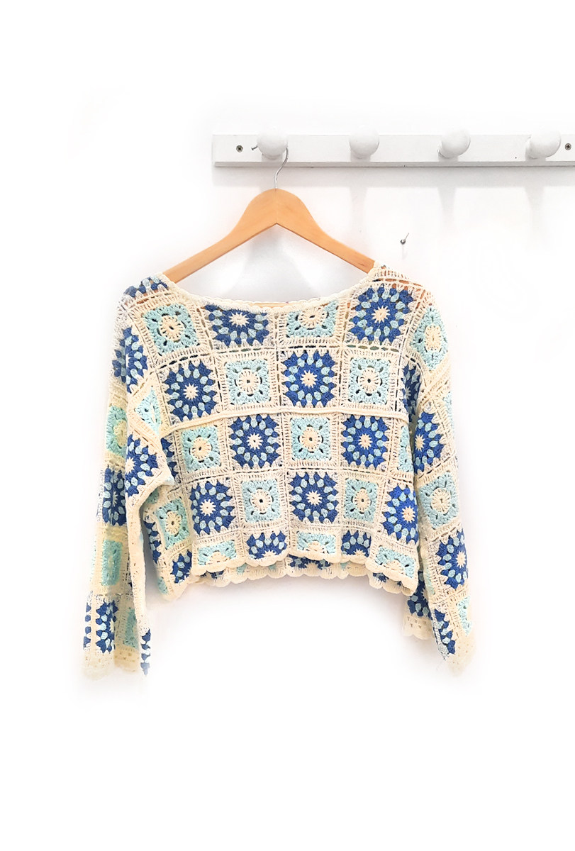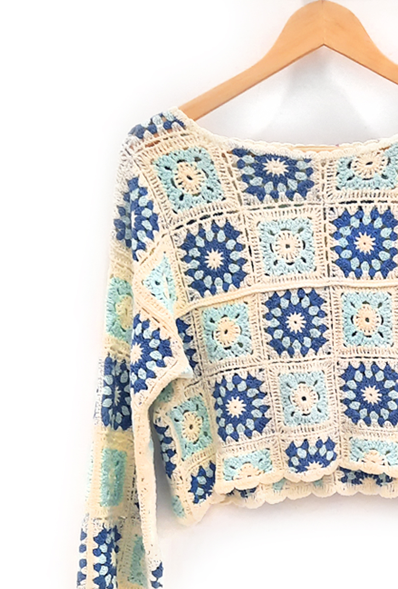 Jersey beige y azul Osho con cuello barco, manga larga ancha y formas en tonos azules y celeste sobre fondo beige. Composición: 95% algodón y 5% poliamida.