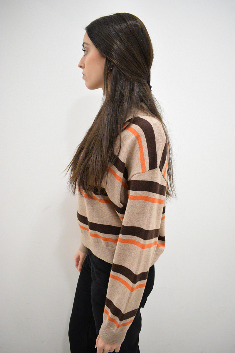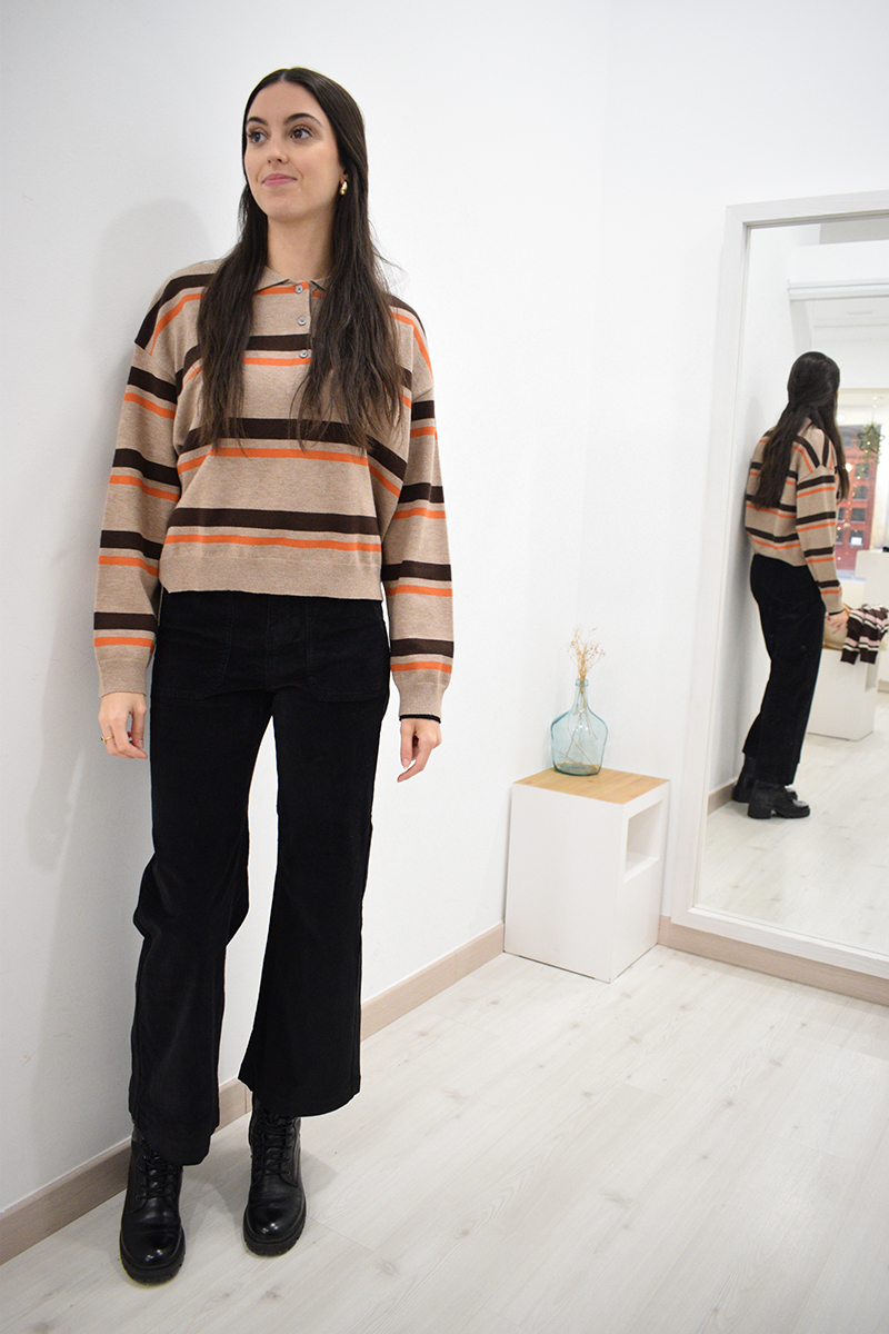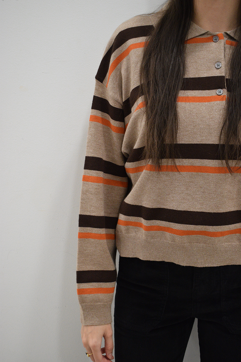 Jersey camel Tomy de punto con cuello polo del mismo tono, tres botones nacarados en color marrón claro y rayas marrones y naranjas.