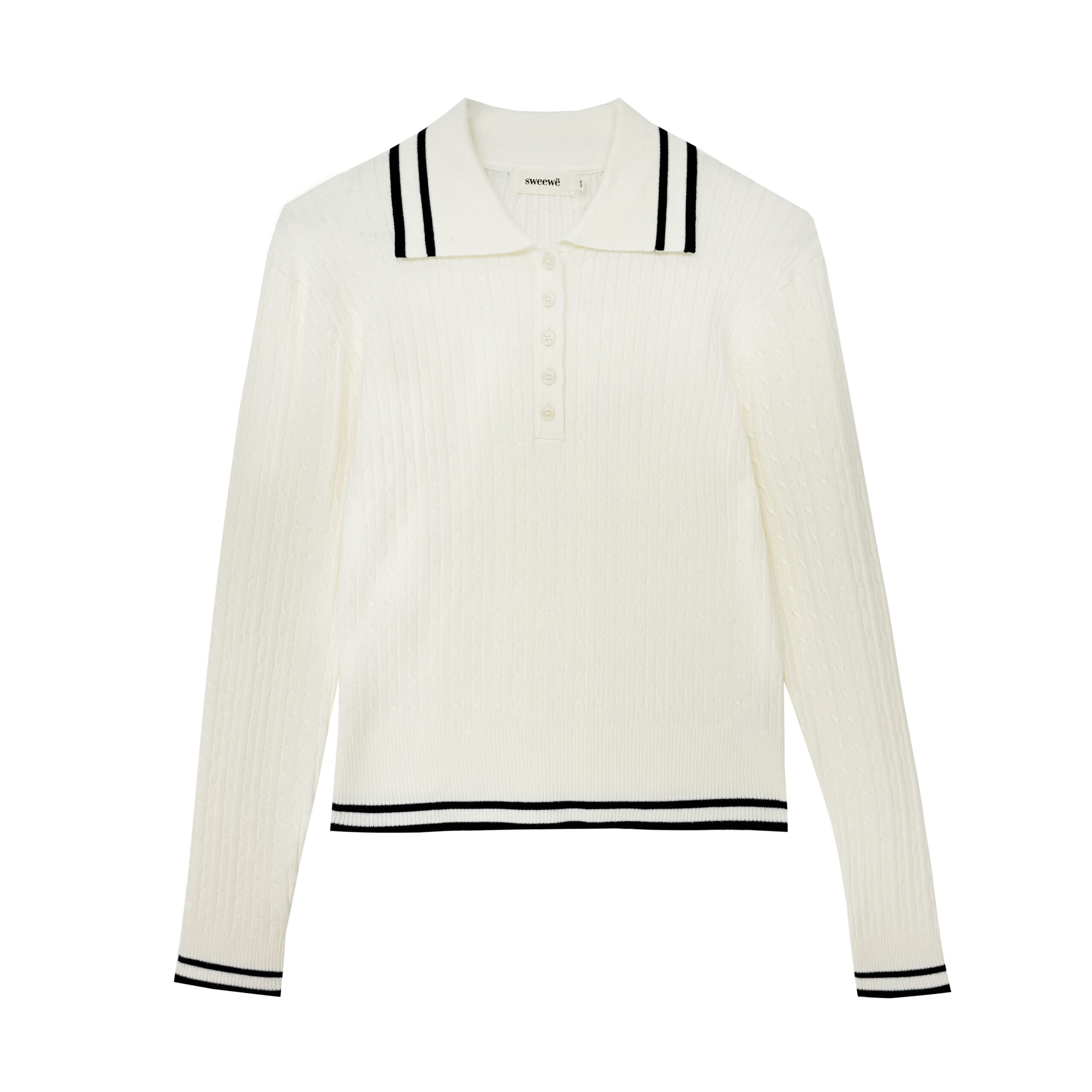 Jersey crudo de punto Raúl con cuello de solapas del mismo tono y botonera color crudo hasta el pecho. Detalle de dos líneas azul marino en mangas, cuello y parte inferior.