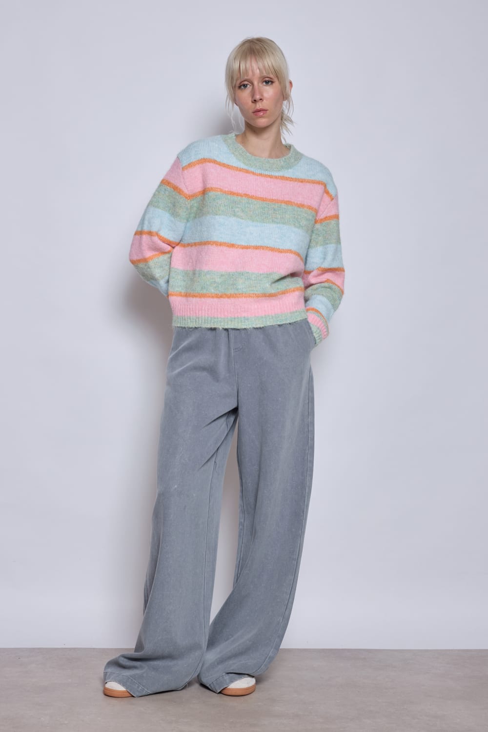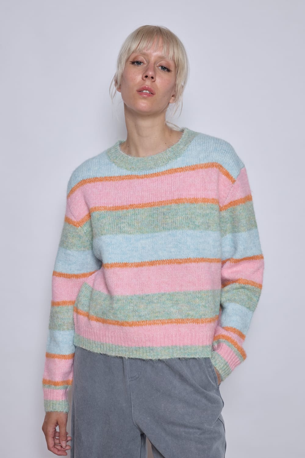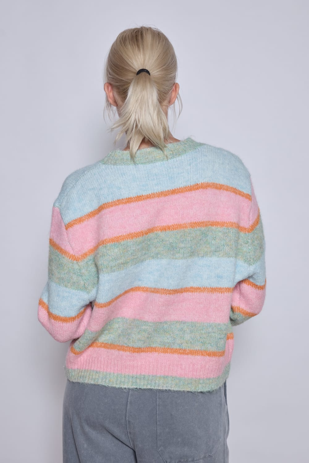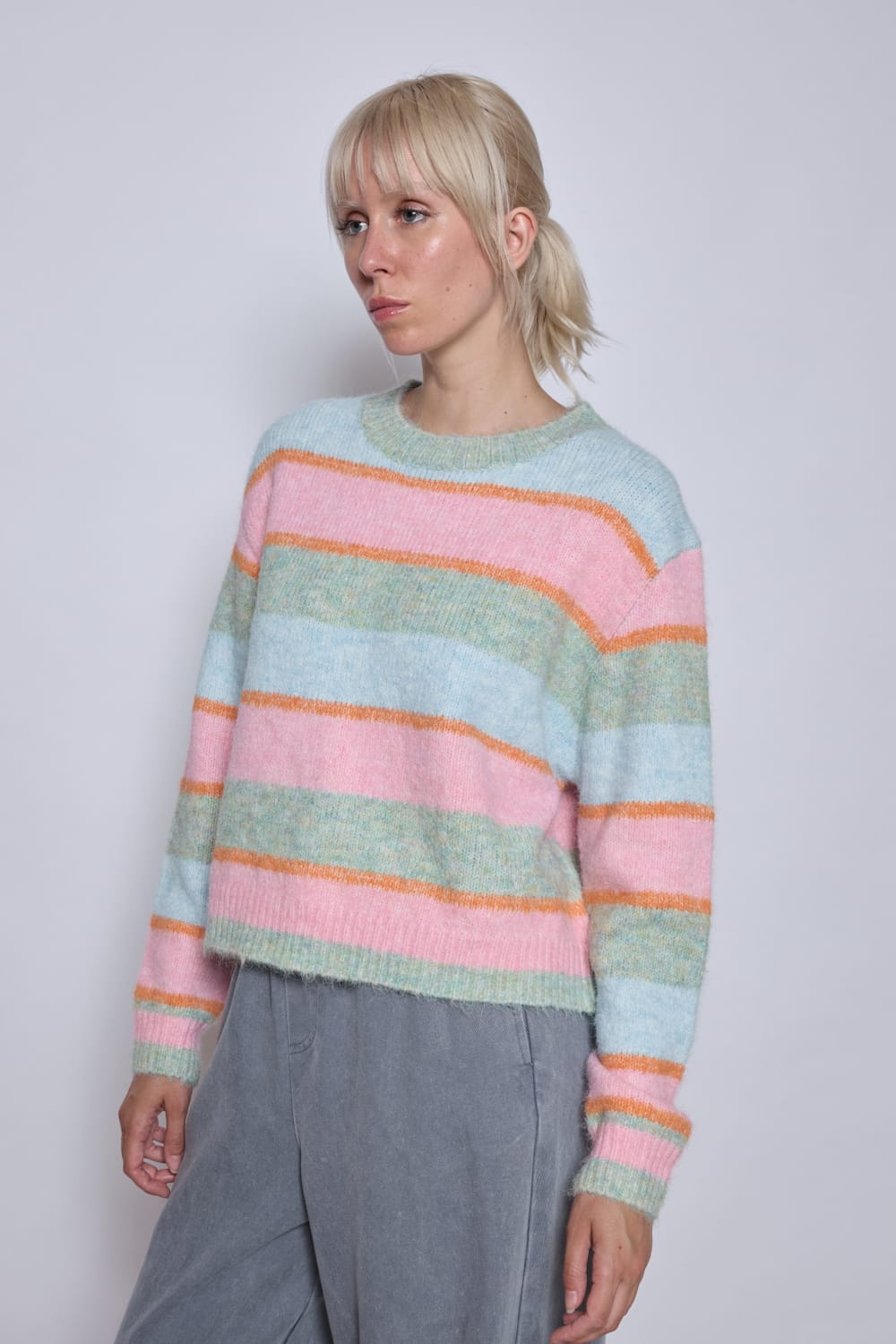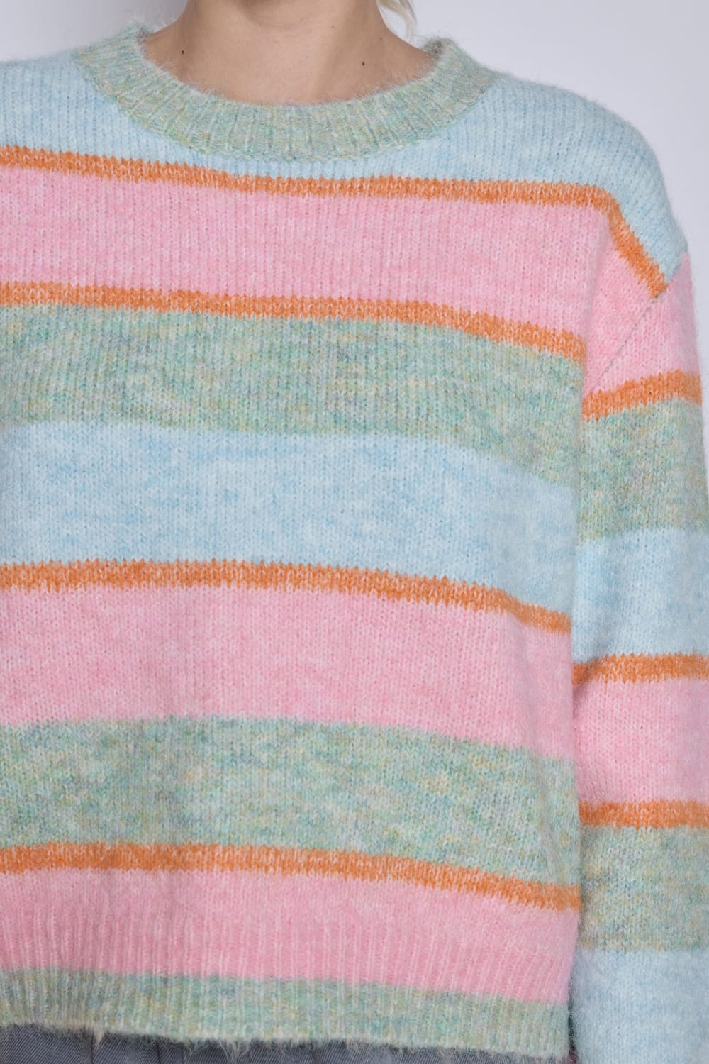 Jersey de punto a rayas Carles con cuello redondo en colores rosa, naranja, azul celeste y aguamarina. Bajo y puños elásticos.