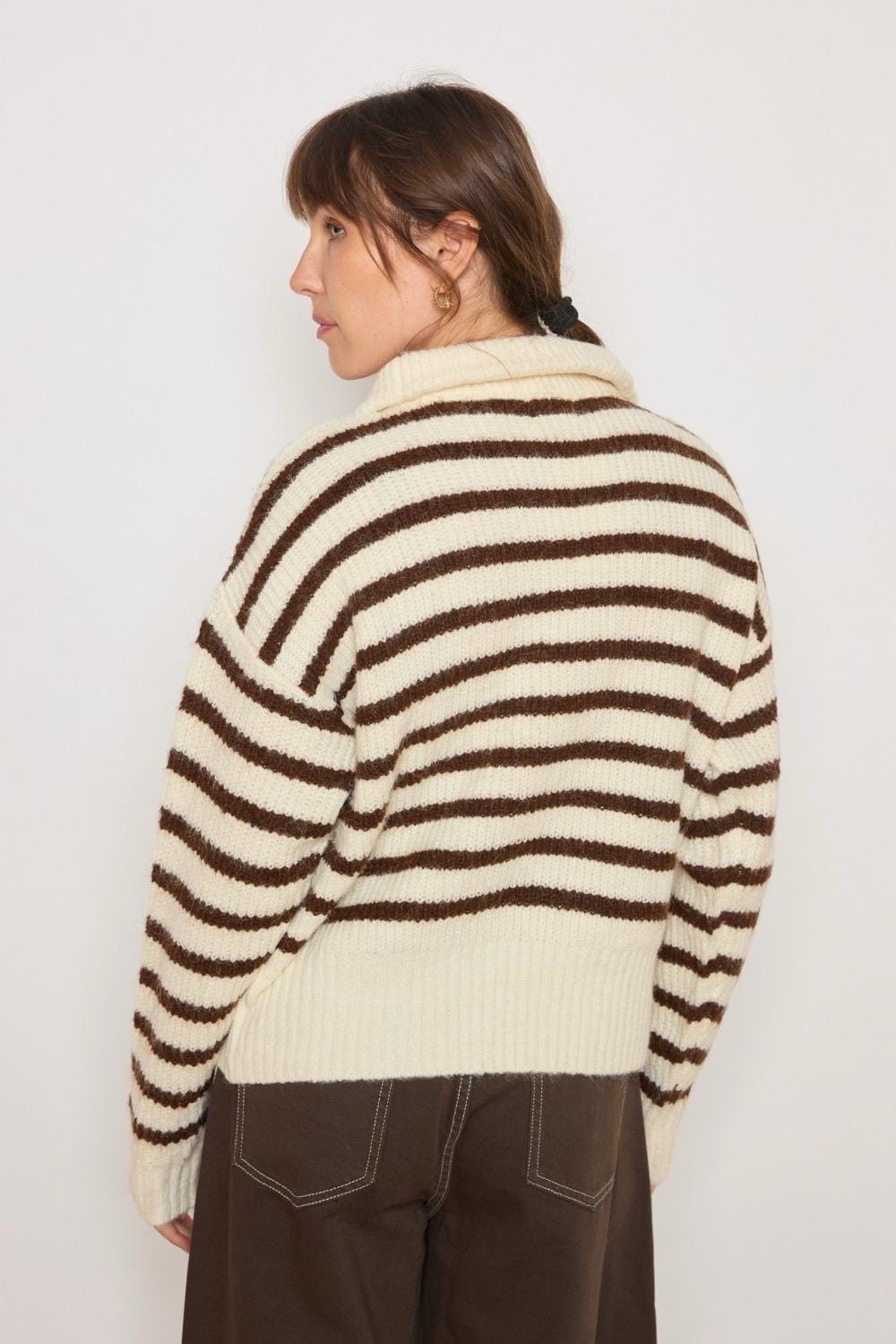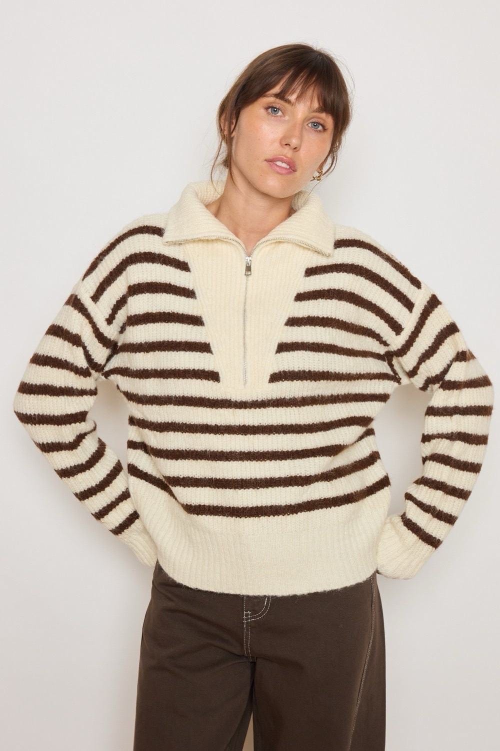Jersey de punto a rayas crudo y marrón Nemie de cuello alto en tono crudo con cremallera metálica de tono plateado. Bajo y puños elásticos.