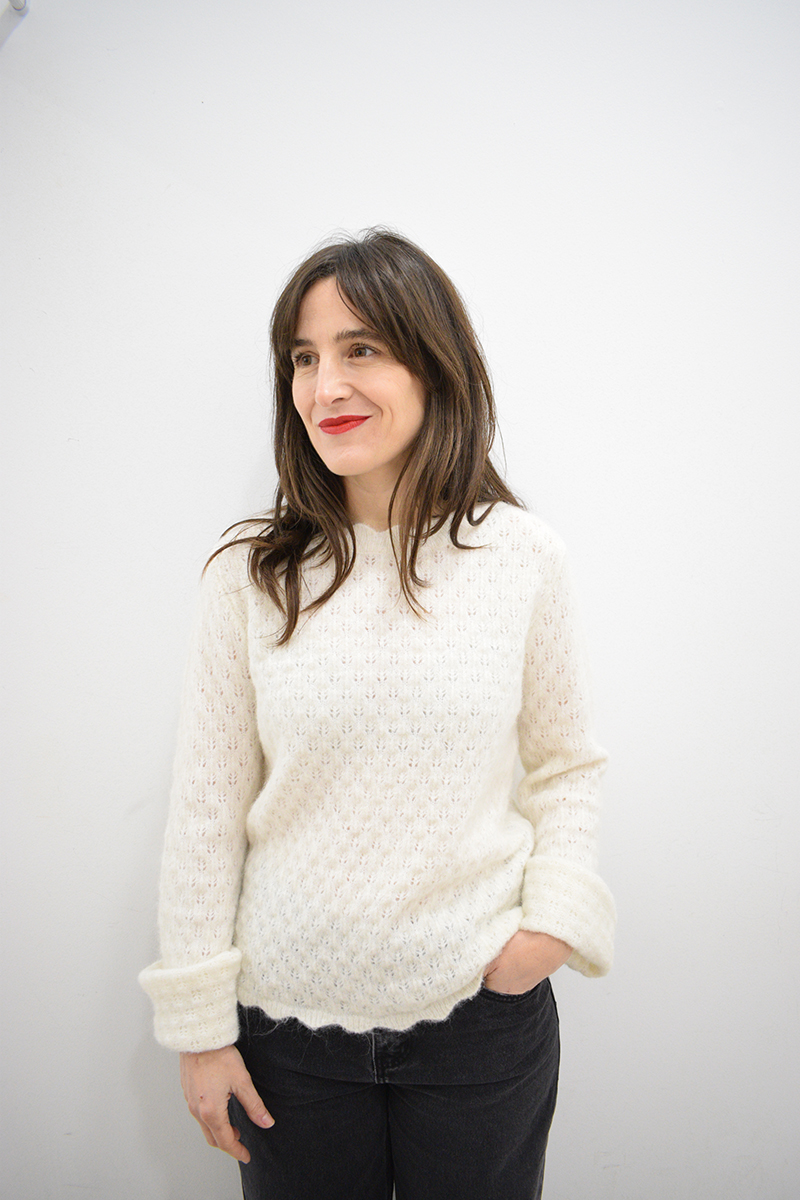 Jersey de punto calado crudo Kiefer de cuello redondo con ribetes formando ondas y mangas que acaban en puño ancho. Composición:  58% poliéster reciclado, 22% poliamida, 18% lana y 2% elastano.