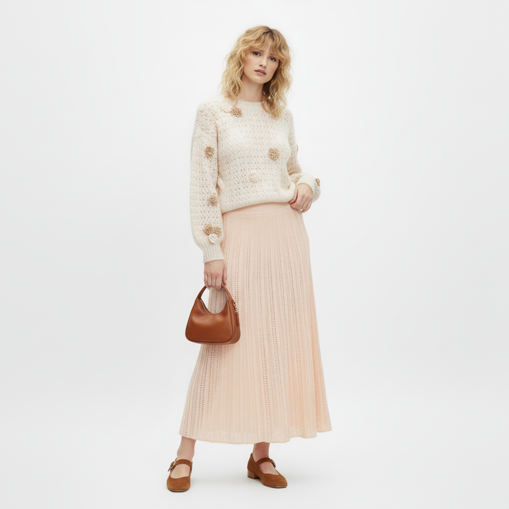 Jersey de punto calado crudo Patsy de cuello redondo con flores cosidas en tonos crudo y beige y puños elásticos.