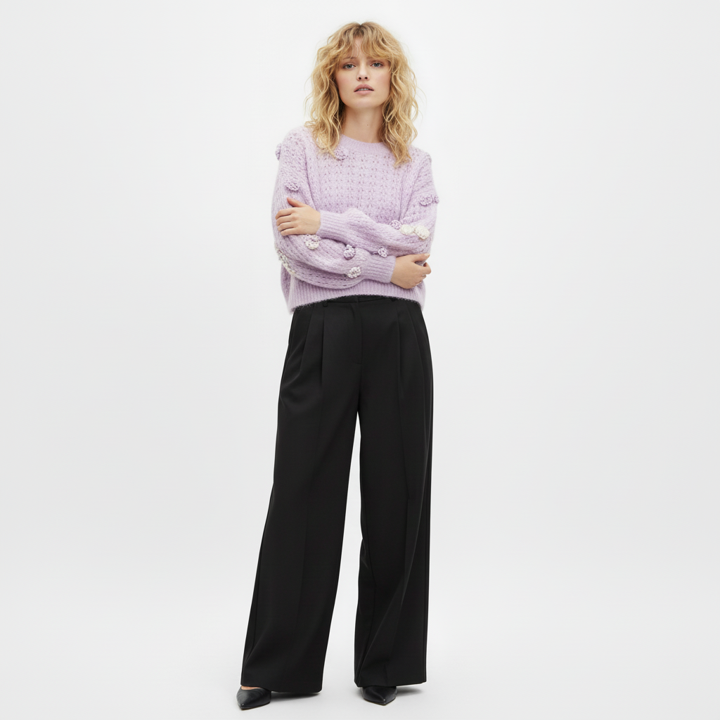 Jersey de punto calado lila Patsy de cuello redondo con flores cosidas en tonos beige y lilla y puños elásticos.