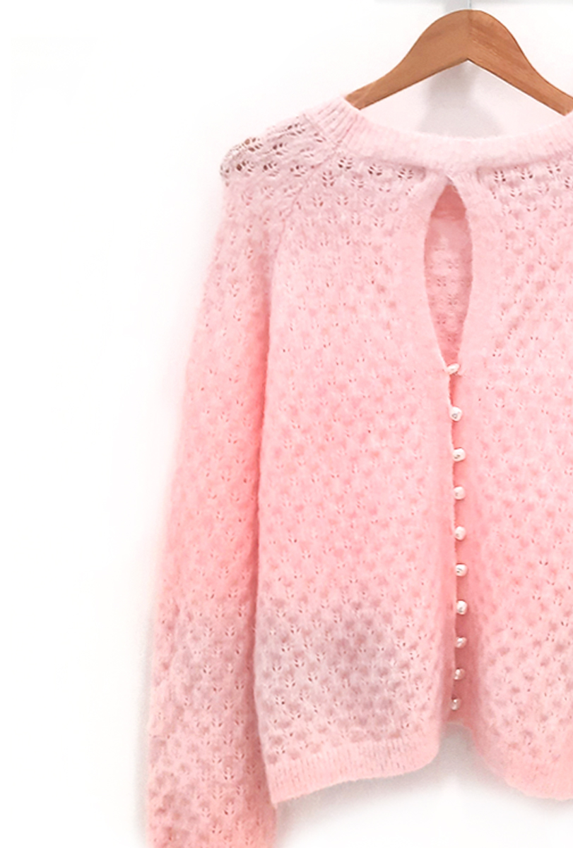 Jersey de punto calado rosa Ray de cuello redondo amplio con puños elásticos, abertura trasera y bajo ella una botonera nacarada.