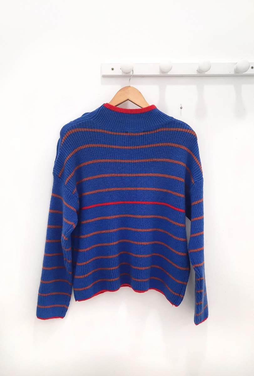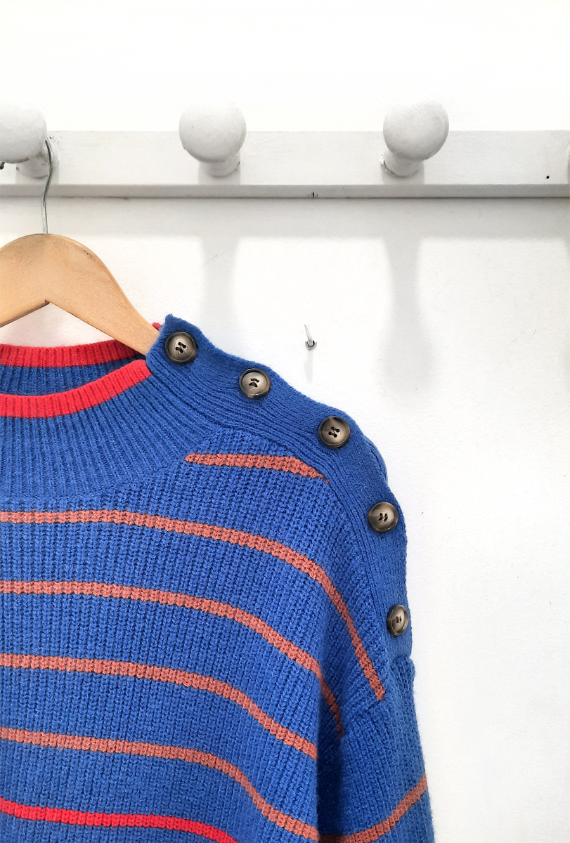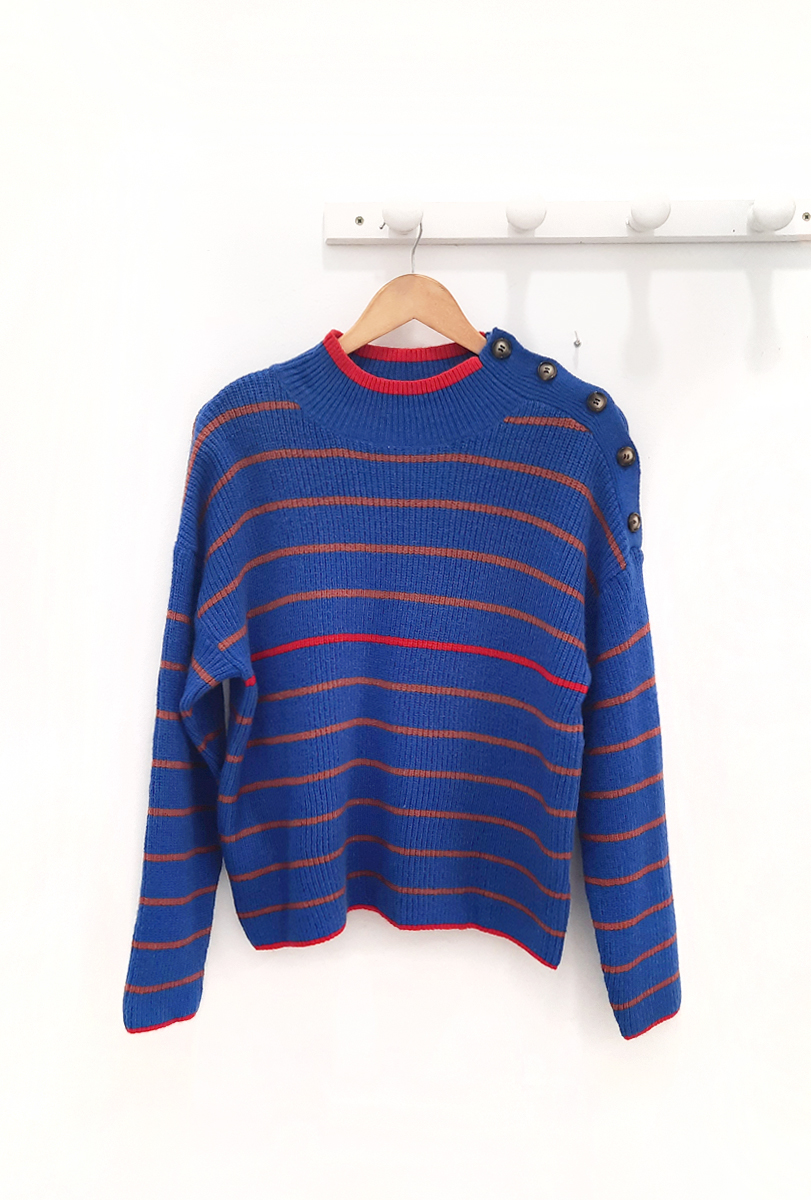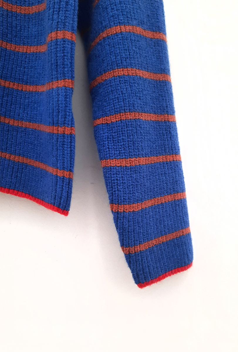 Jersey de rayas azul Matt de punto con cuello redondo con ribete rojo y botonera marrón en gradiente a claro en el hombro izquierdo. Rayas en color teja y rojo por ambos lados y mangas sin puños ribeteadas en rojo.
