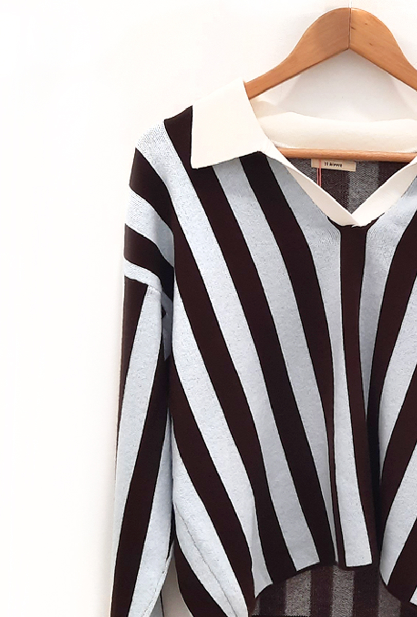 Jersey de rayas marrón azul Cosmo de punto con cuello en pico tipo polo en color crudo y puños elásticos.