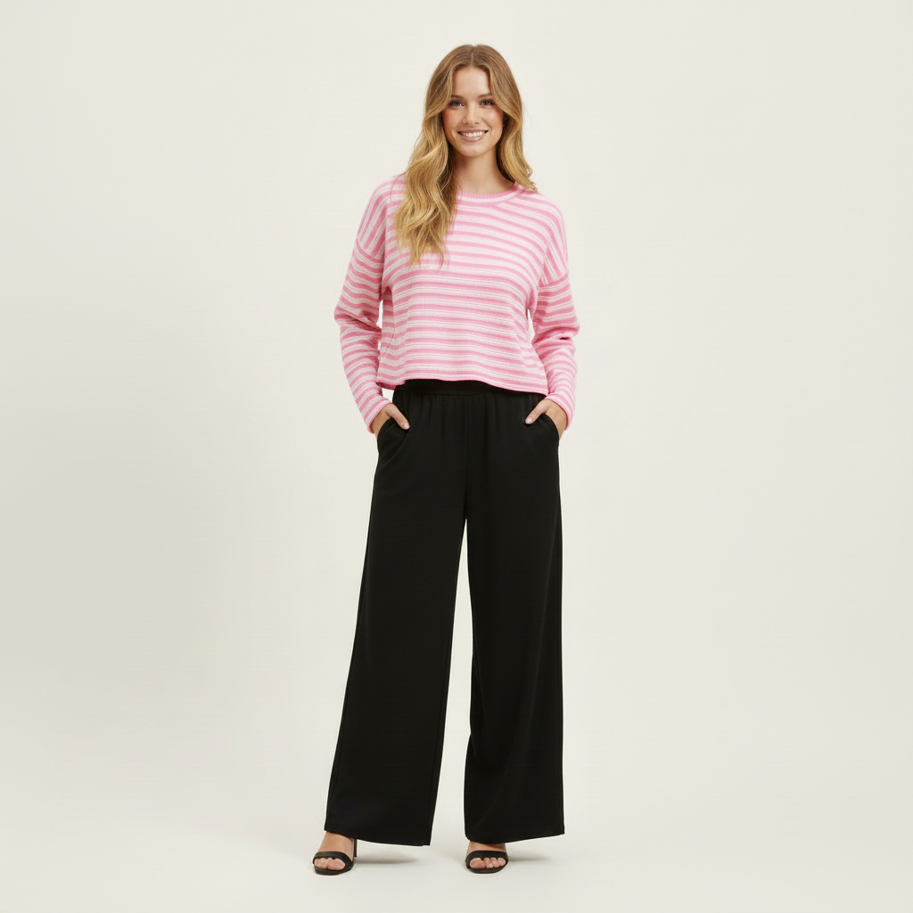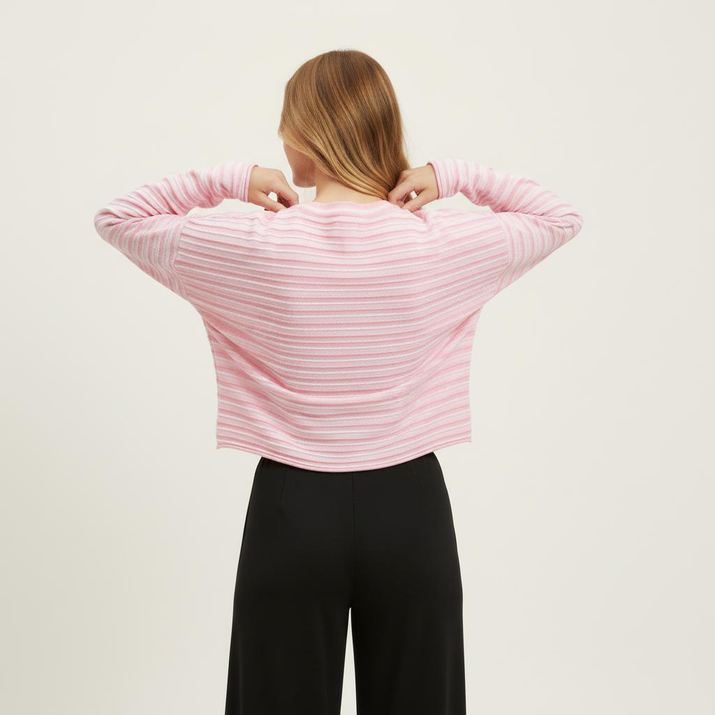 Jersey de rayas rosa Elías con cuello redondo, hombros caídos, mangas sin puños y pequeña abertura lateral en el bajo. Rayas en tonos rosa y rosa claro.