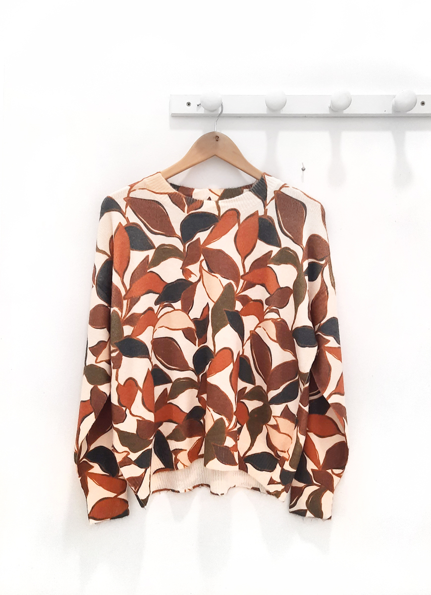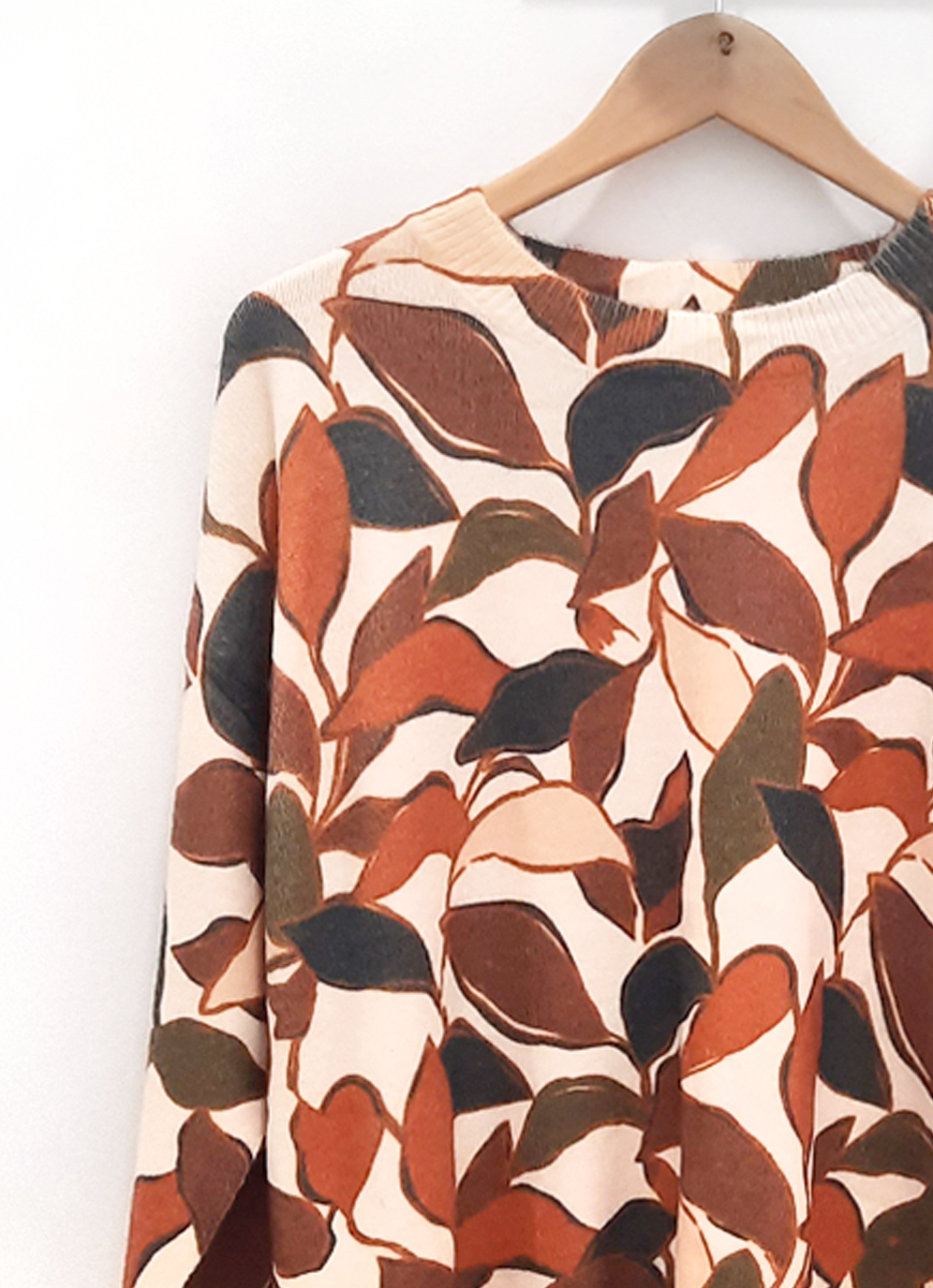 Jersey estampado naranja Fall de punto, con motivos vegetales otoñales, cuello redondo, manga larga y bajo y puños elásticos.
