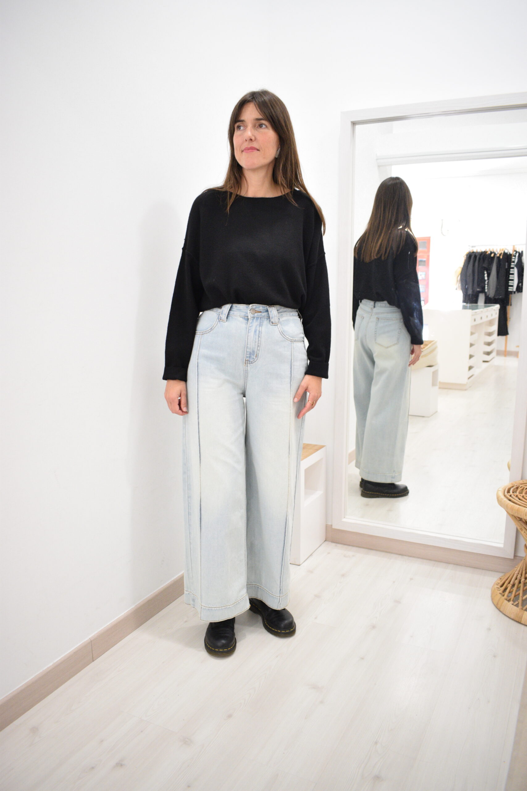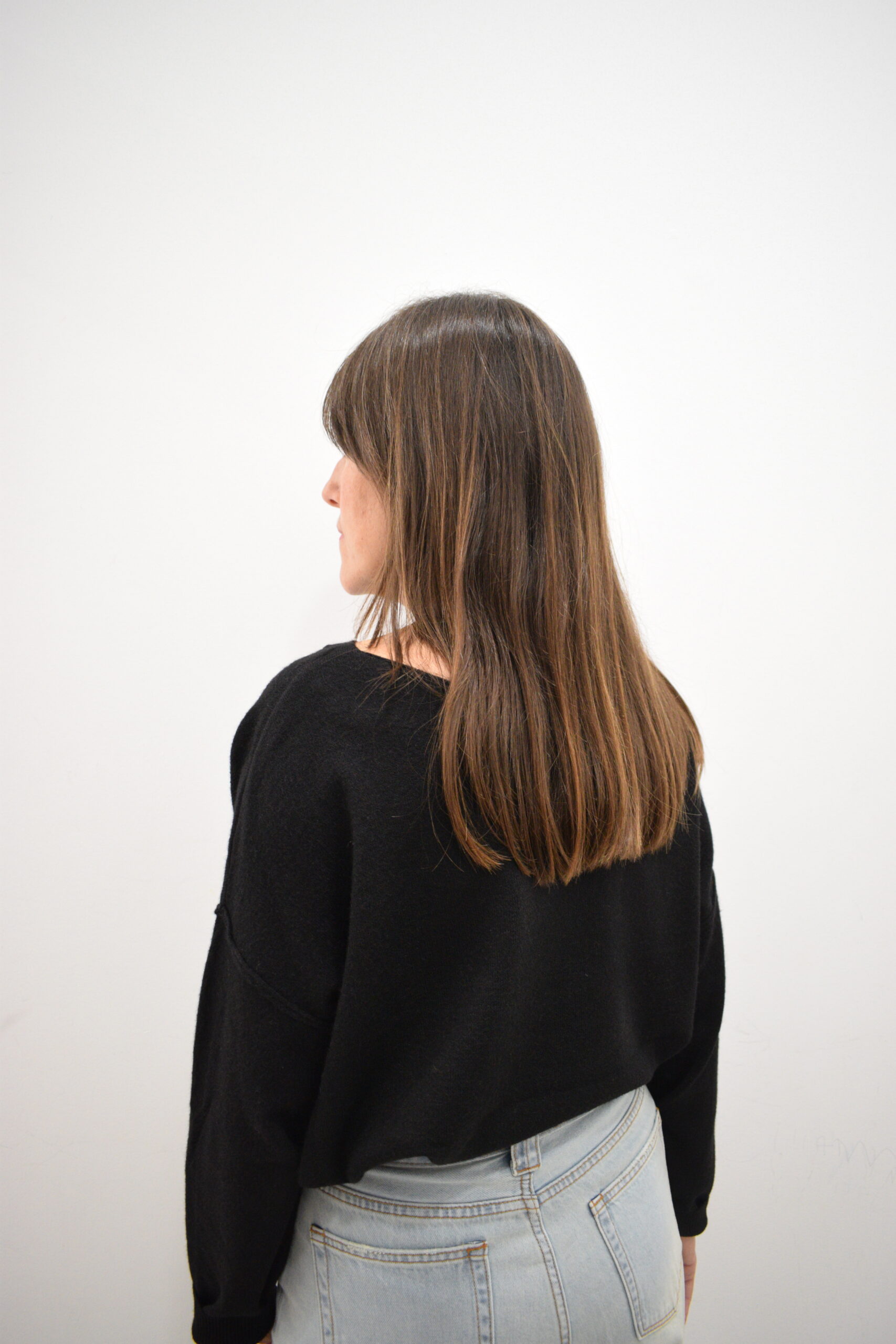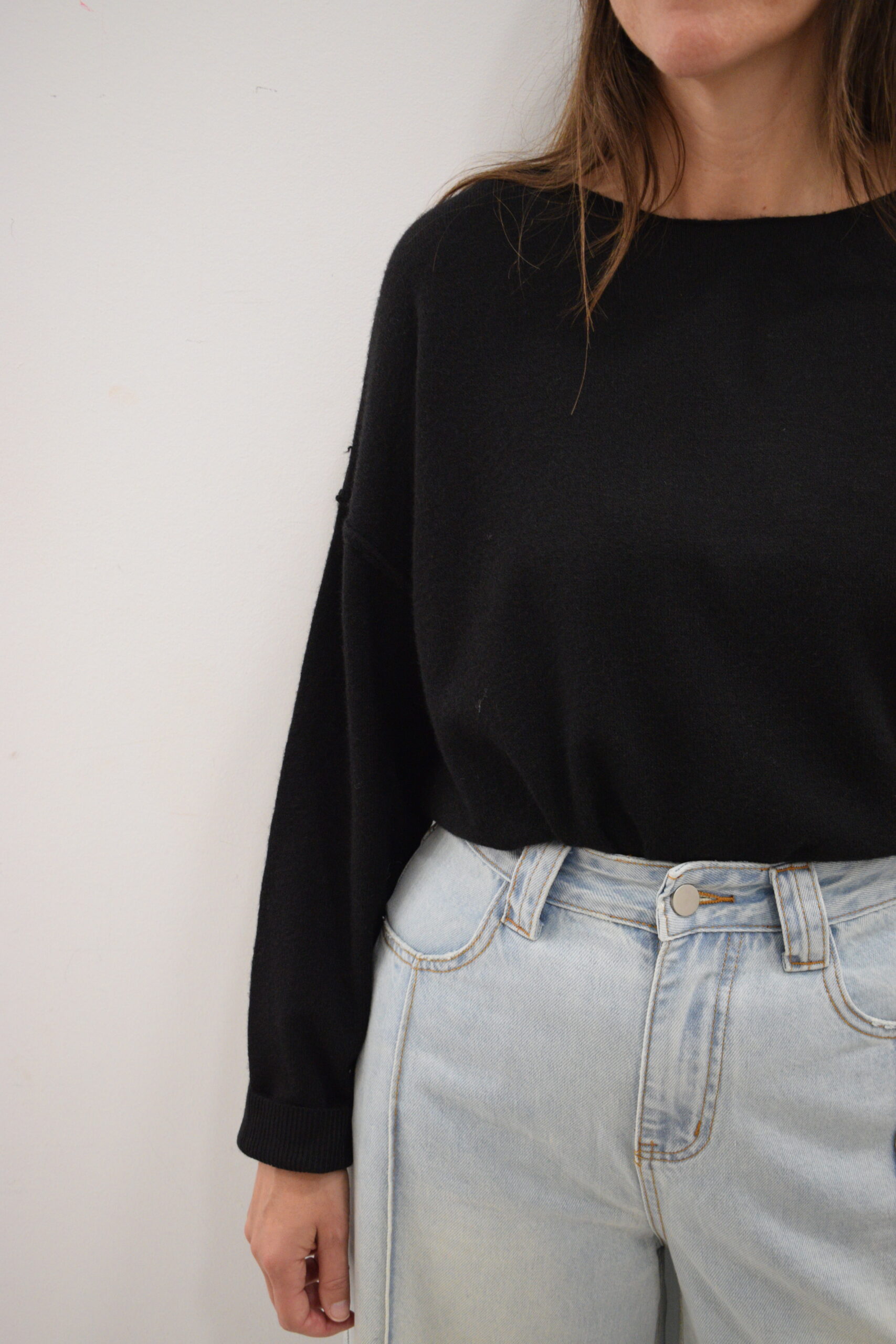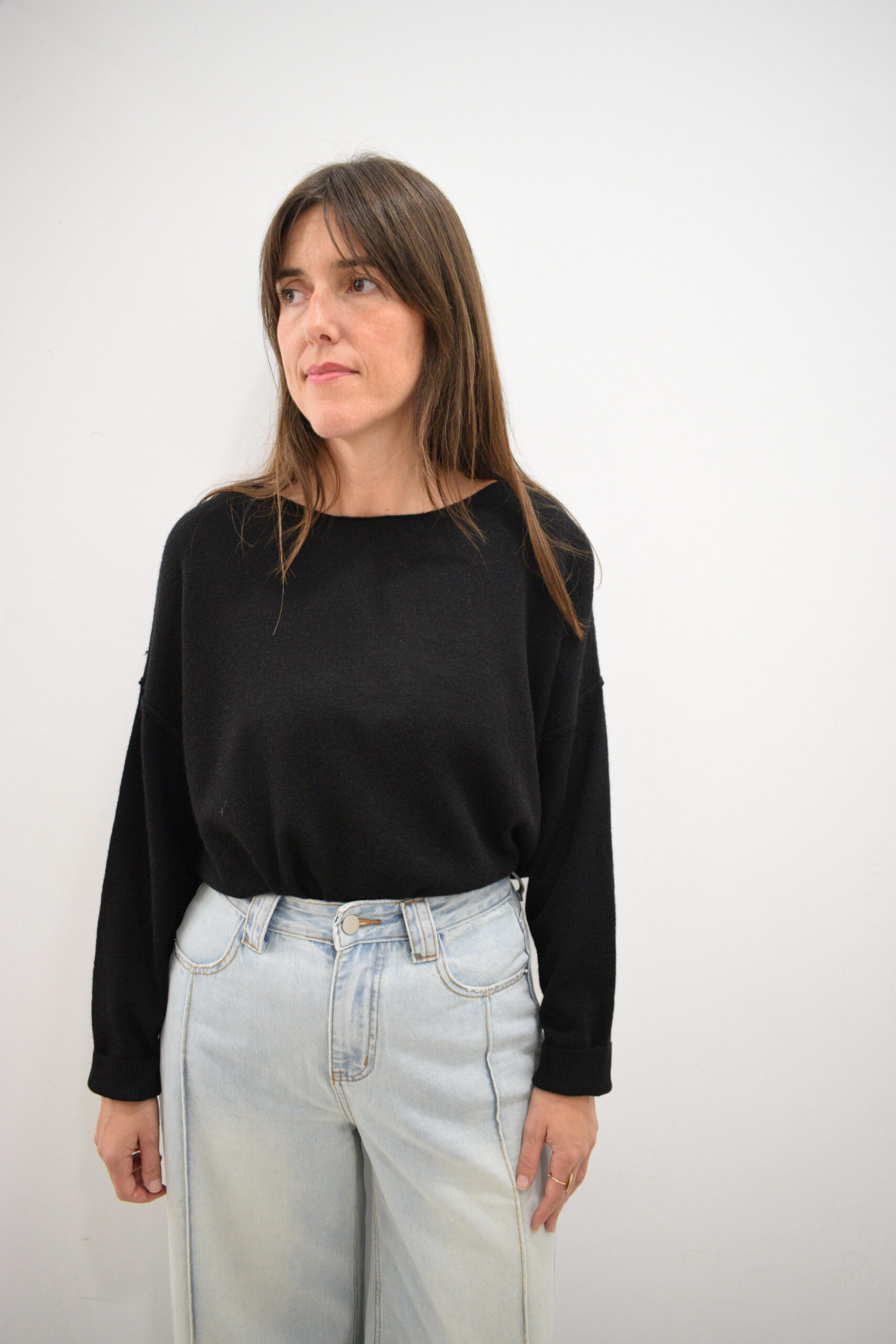 Jersey de punto fino color negro con cuello barco y hombros caídos, aberturas laterales en la parte inferior y puños elásticos.