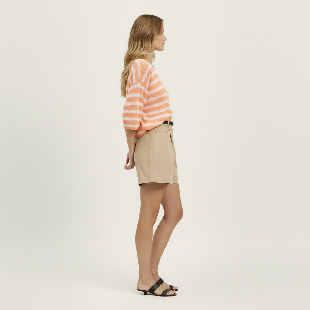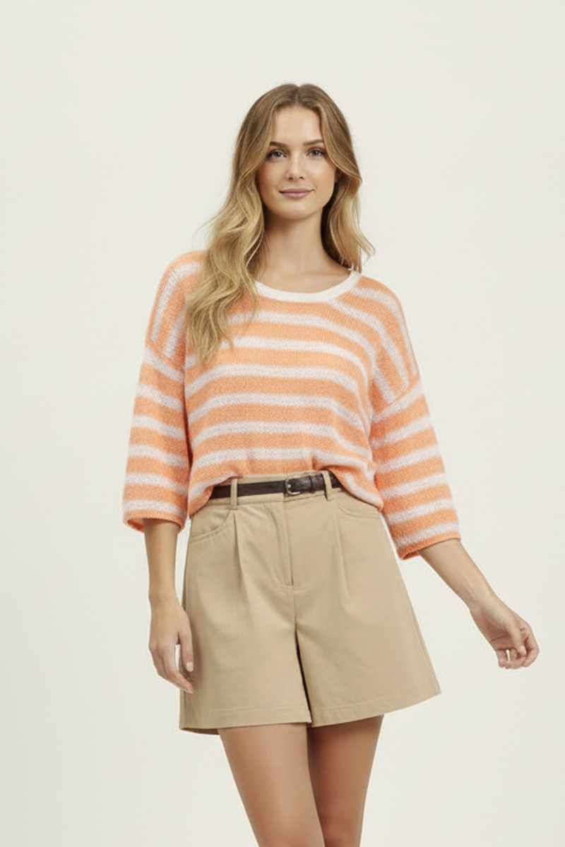 Jersey de rayas naranja y crudo Lidia de cuello redondo amplio con ribete y media manga. Composición: 55% acrílico, 36% poliamida y 8% lana.