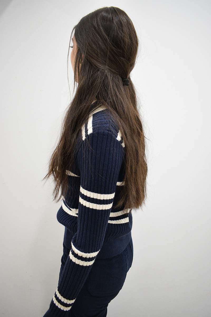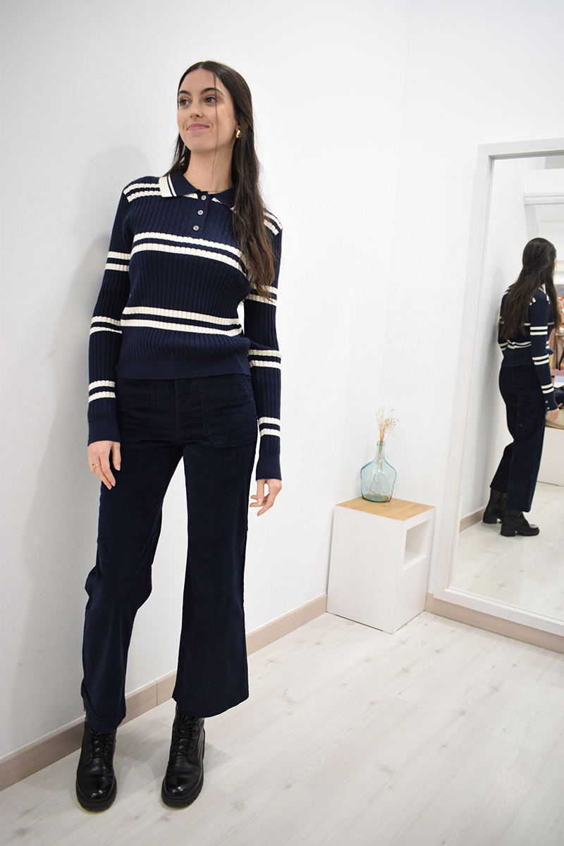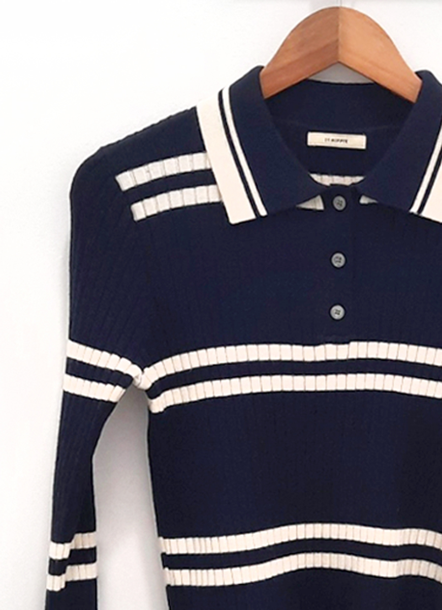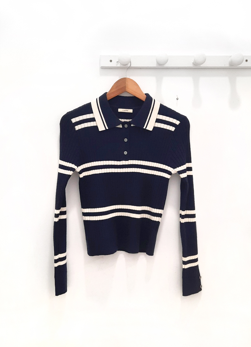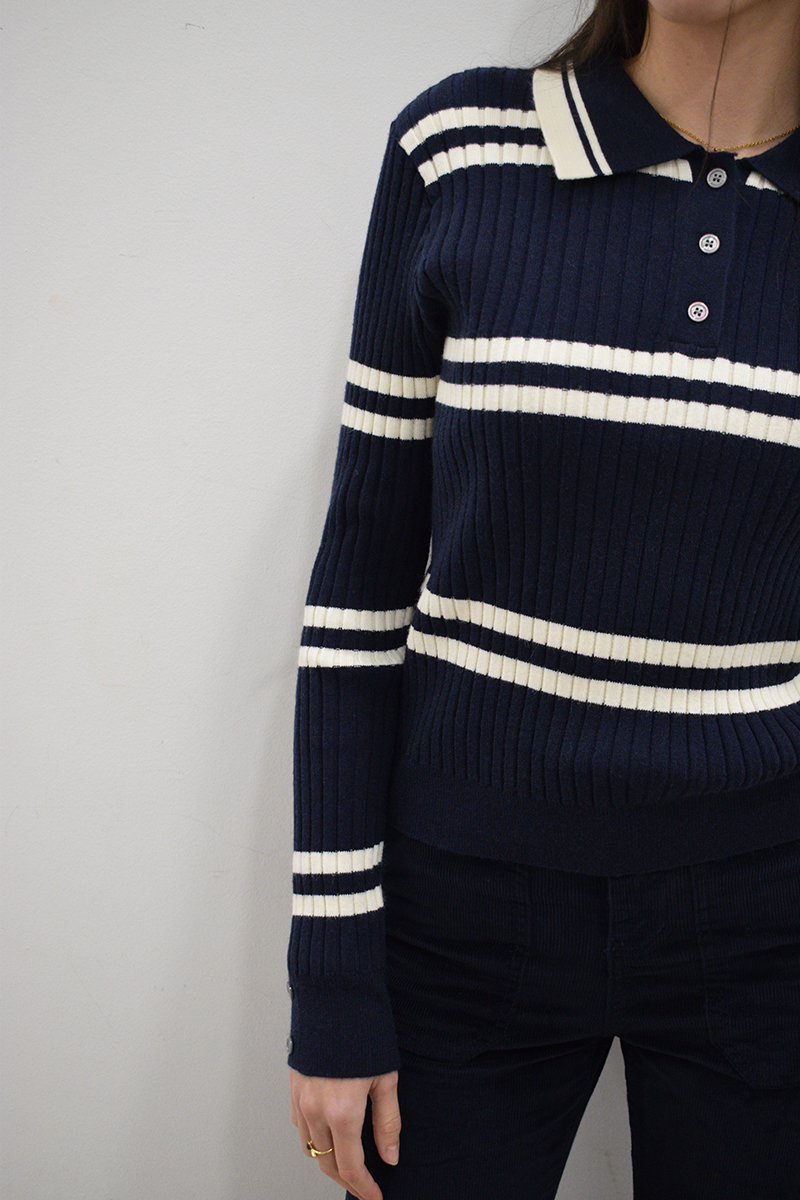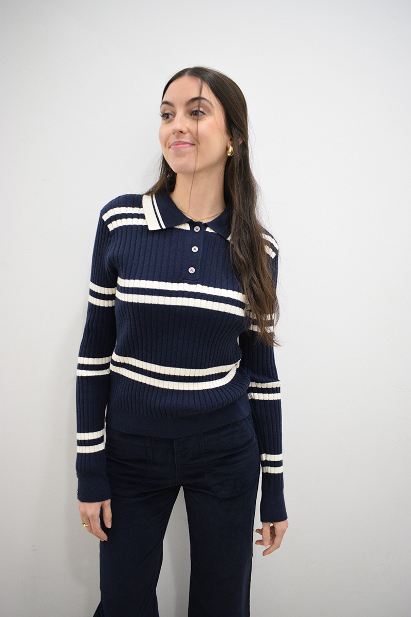 Jersey polo azul marino Aqua de punto, manga larga, con doble raya en tono crudo, tres botones nacarados en el pecho y dos en los puños.