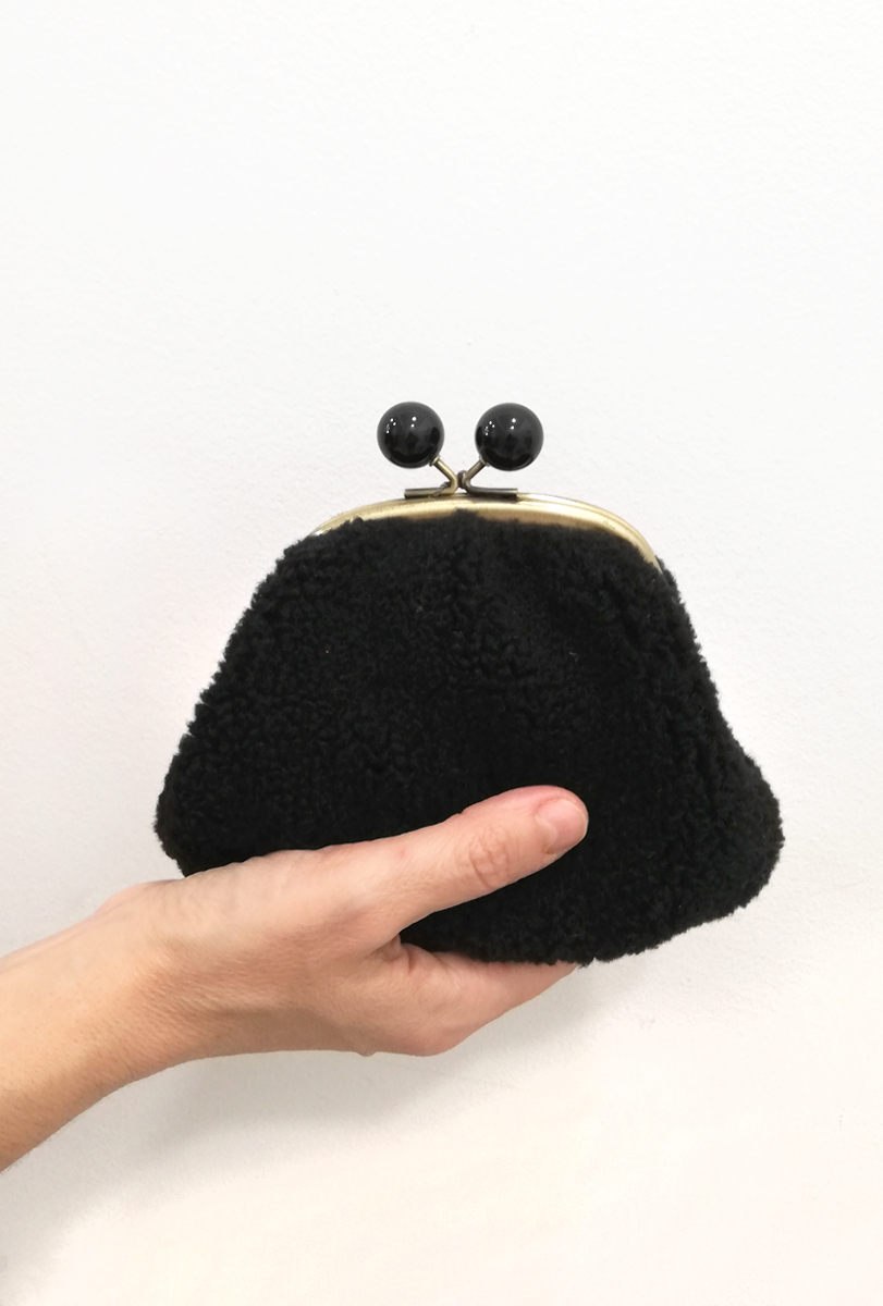 Monedero negro Dolly de tejido que simula borreguillo. Interior de un único departamento con forro en tono beige.