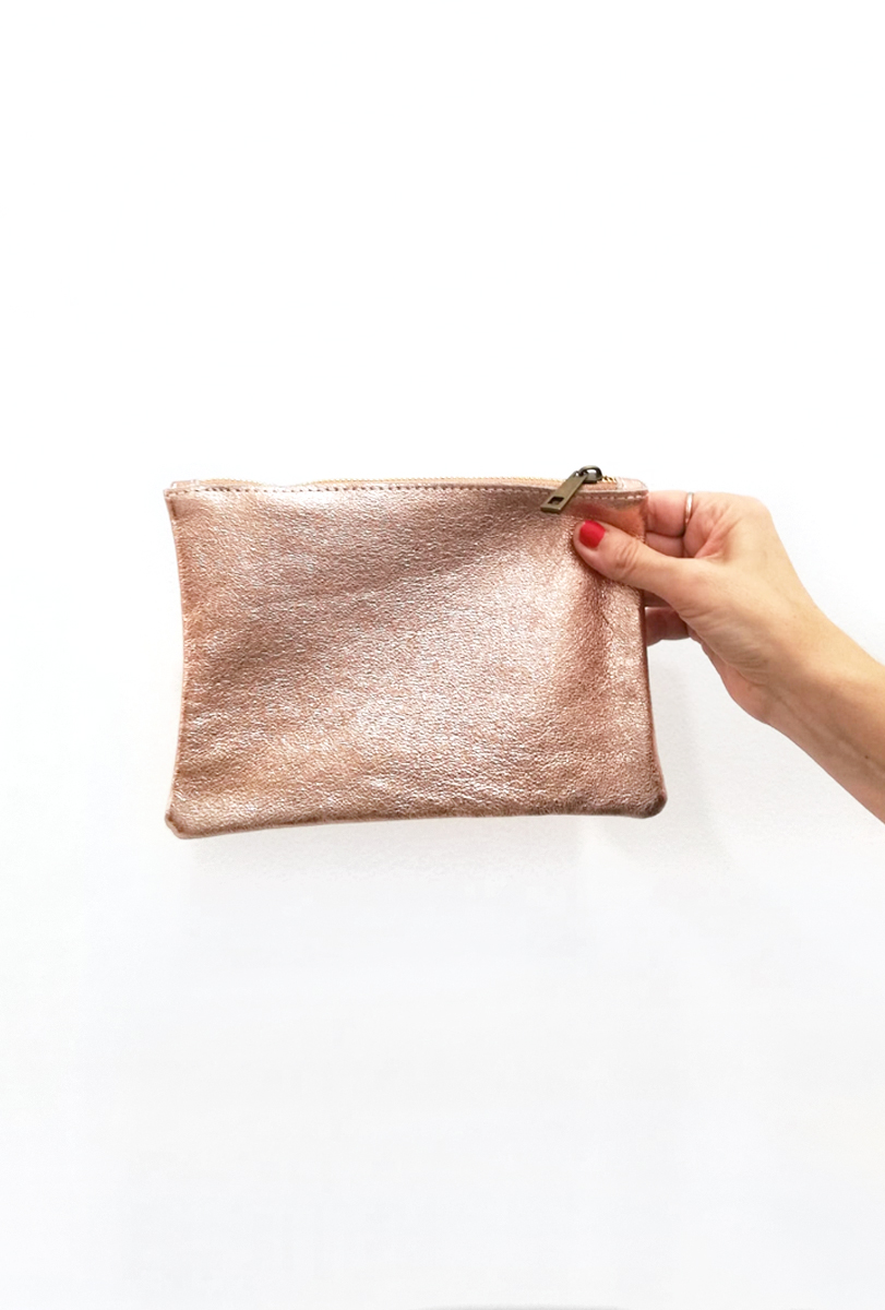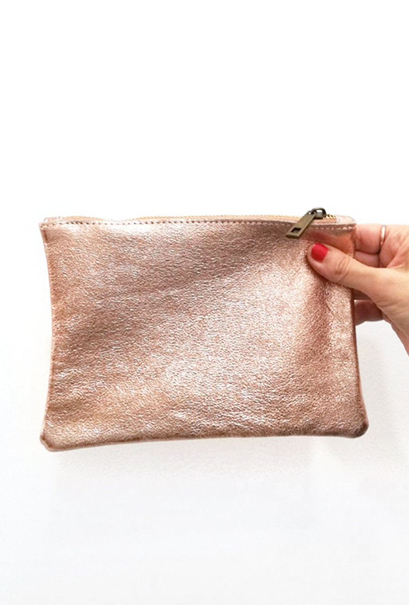 Neceser rosa palo Milo de efecto gliter con cremallera en tono dorado y un único departamento interior.