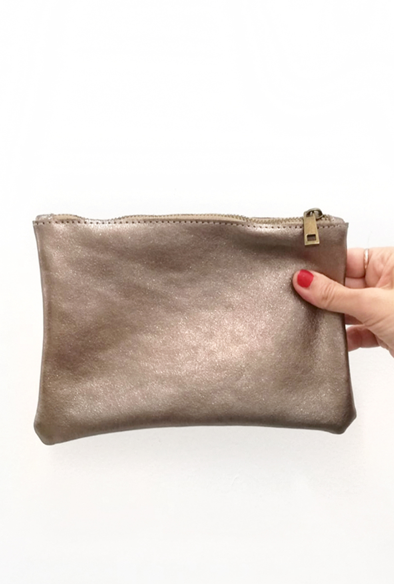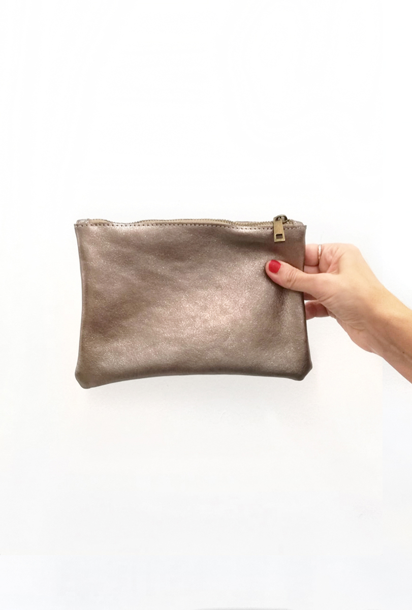 Neceser taupé Milo de efecto gliter con cremallera en tono dorado y un único departamento interior.