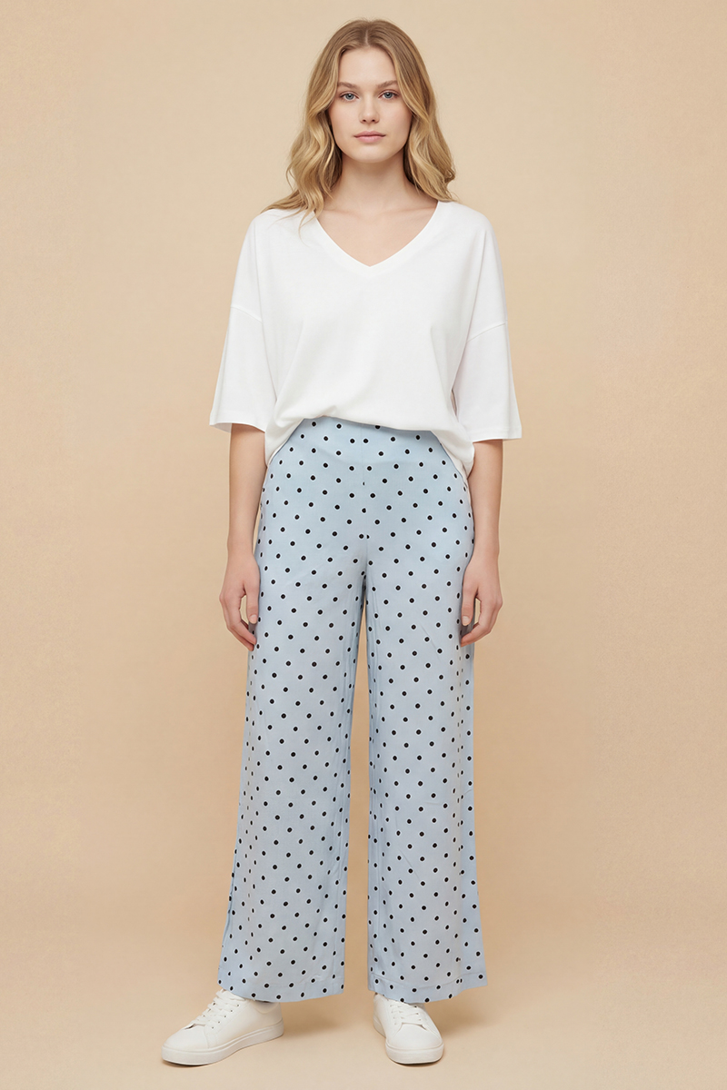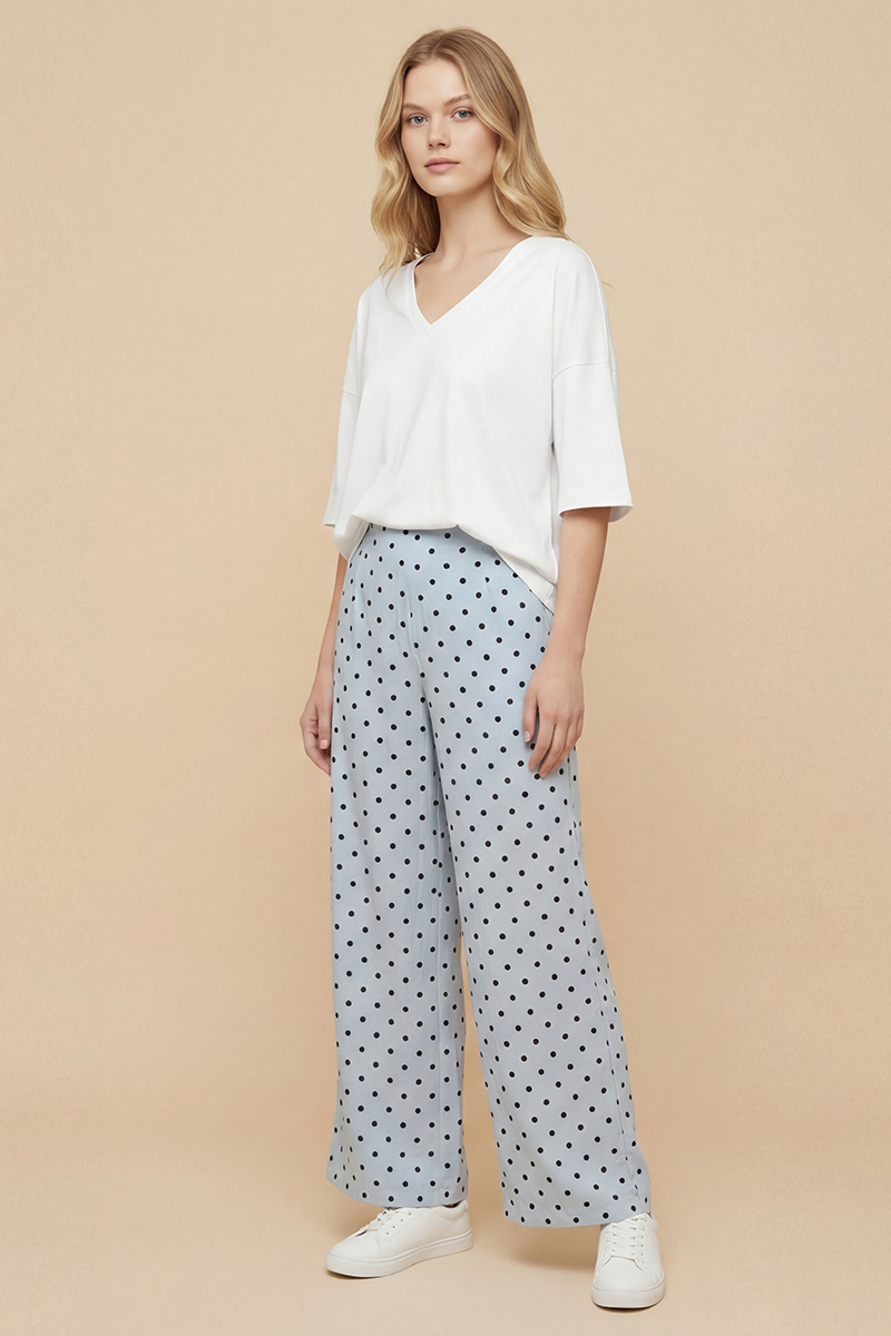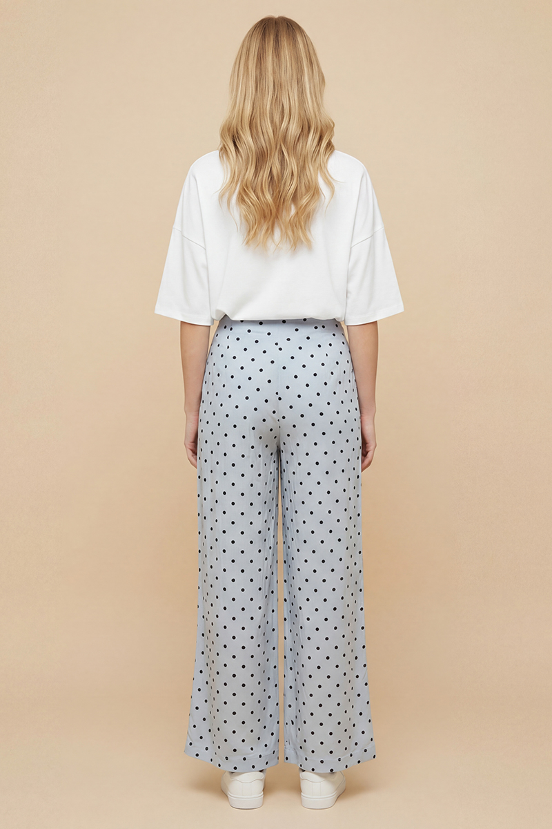 Pantalón azul de lunares Balmudo de pata ancha, largo, sin bolsillos y con cierre de cremallera integrado en la costura lateral izquierda. Composición: 90% viscosa y 10% poliéster. Forro: 100% viscosa.