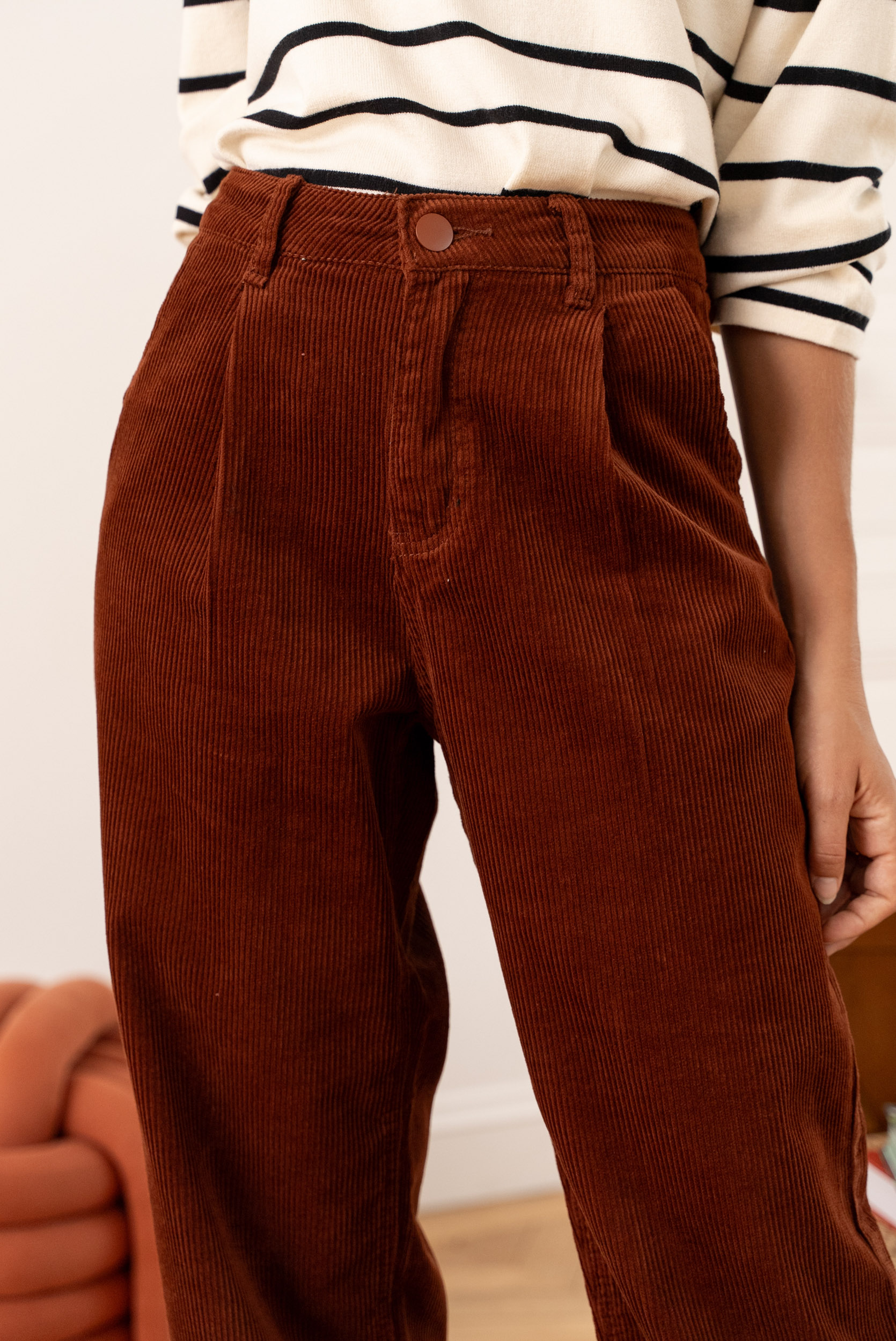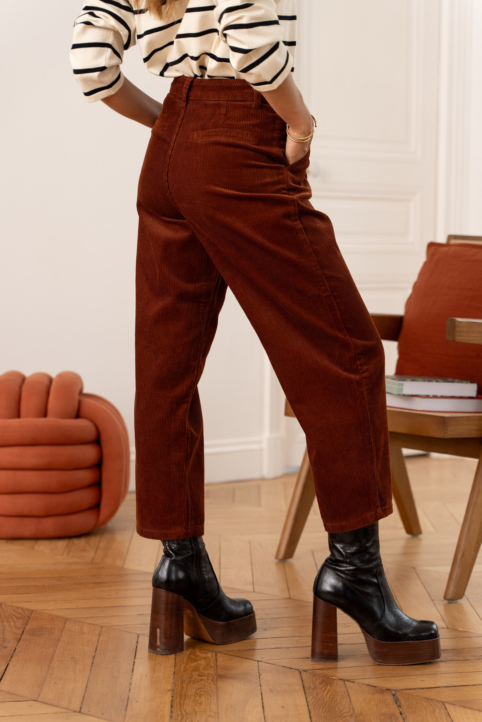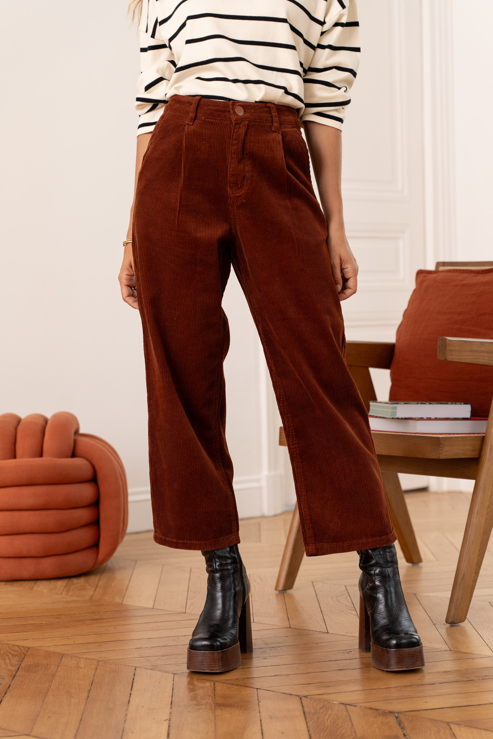 Pantalón de pana marrón Romel de pata ancha y largura sobre los tobillos, con botón marrón, trabillas para cinturón, dos bolsillos delanteros y dos falsos bolsillos traseros.