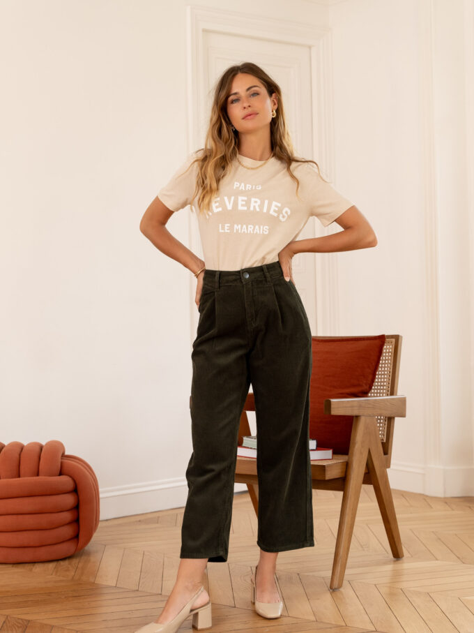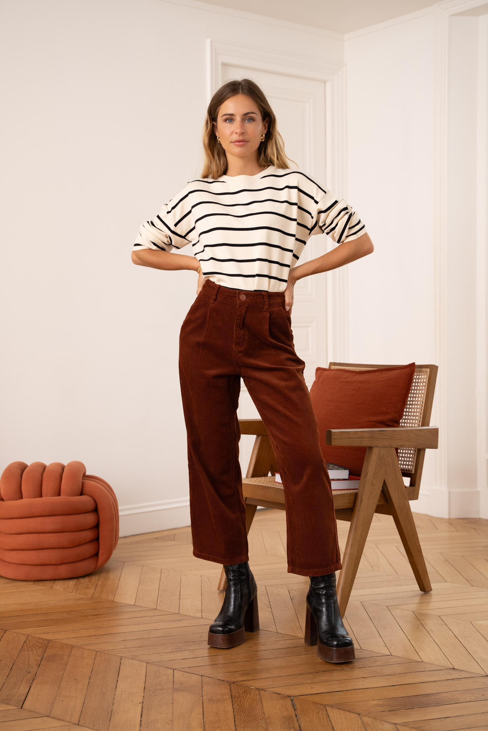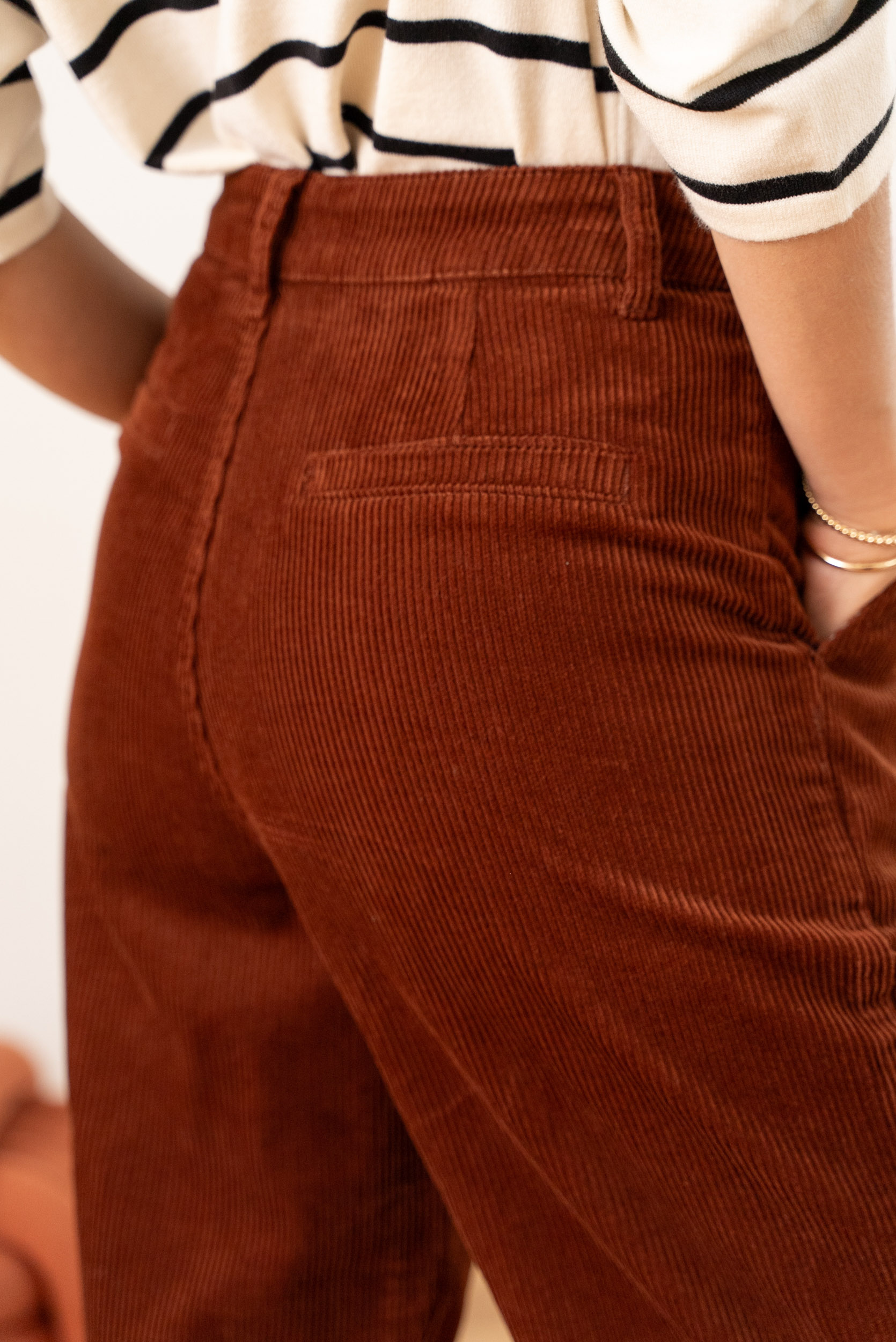 Pantalón de pana marrón Romel de pata ancha y largura sobre los tobillos, con botón marrón, trabillas para cinturón, dos bolsillos delanteros y dos falsos bolsillos traseros.