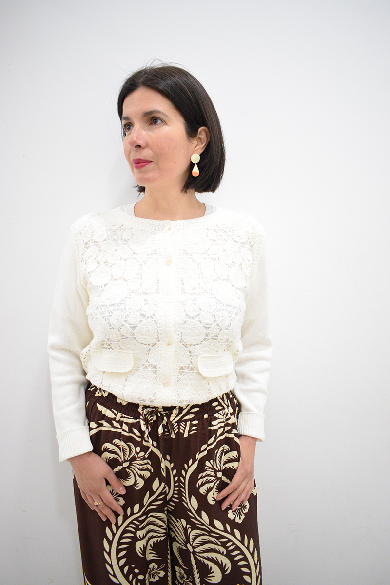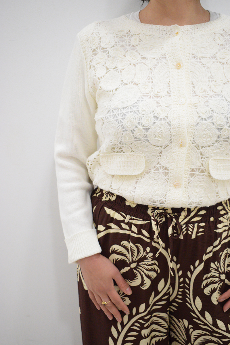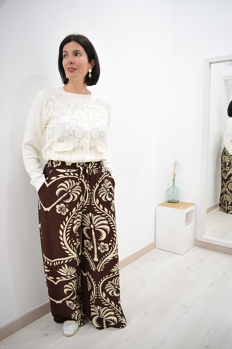 Pantalón de pata ancha marrón Seiji con goma en la cintura, bolsillos laterales y estampado de flores beiges. Composición: 88% algodón y 12% poliamida.