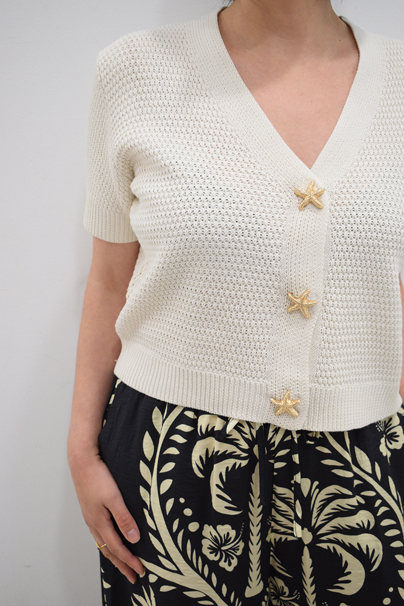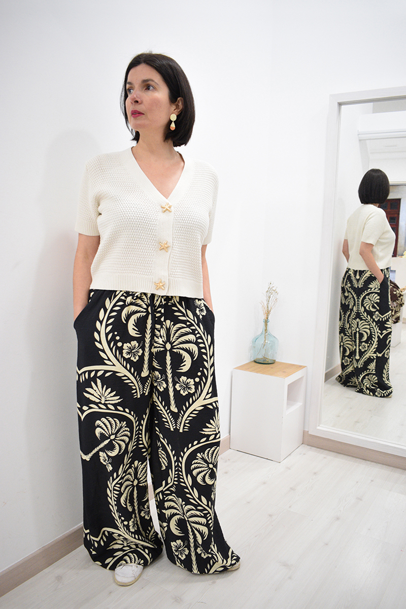 Pantalón de pata ancha negro Seiji con goma y cordoncillo en la cintura, bolsillos laterales y estampado de flores beiges. Composición: 88% algodón y 12% poliamida.
