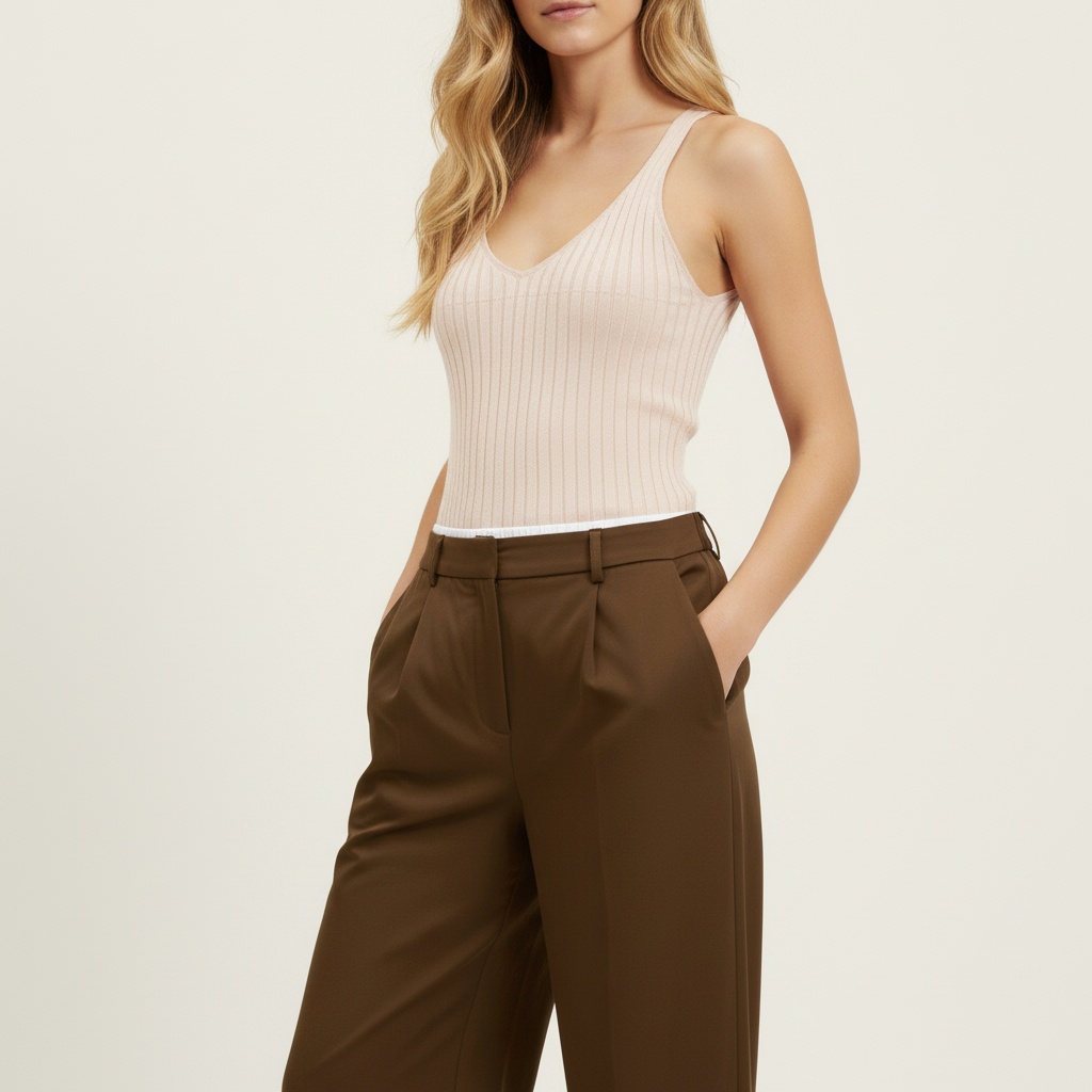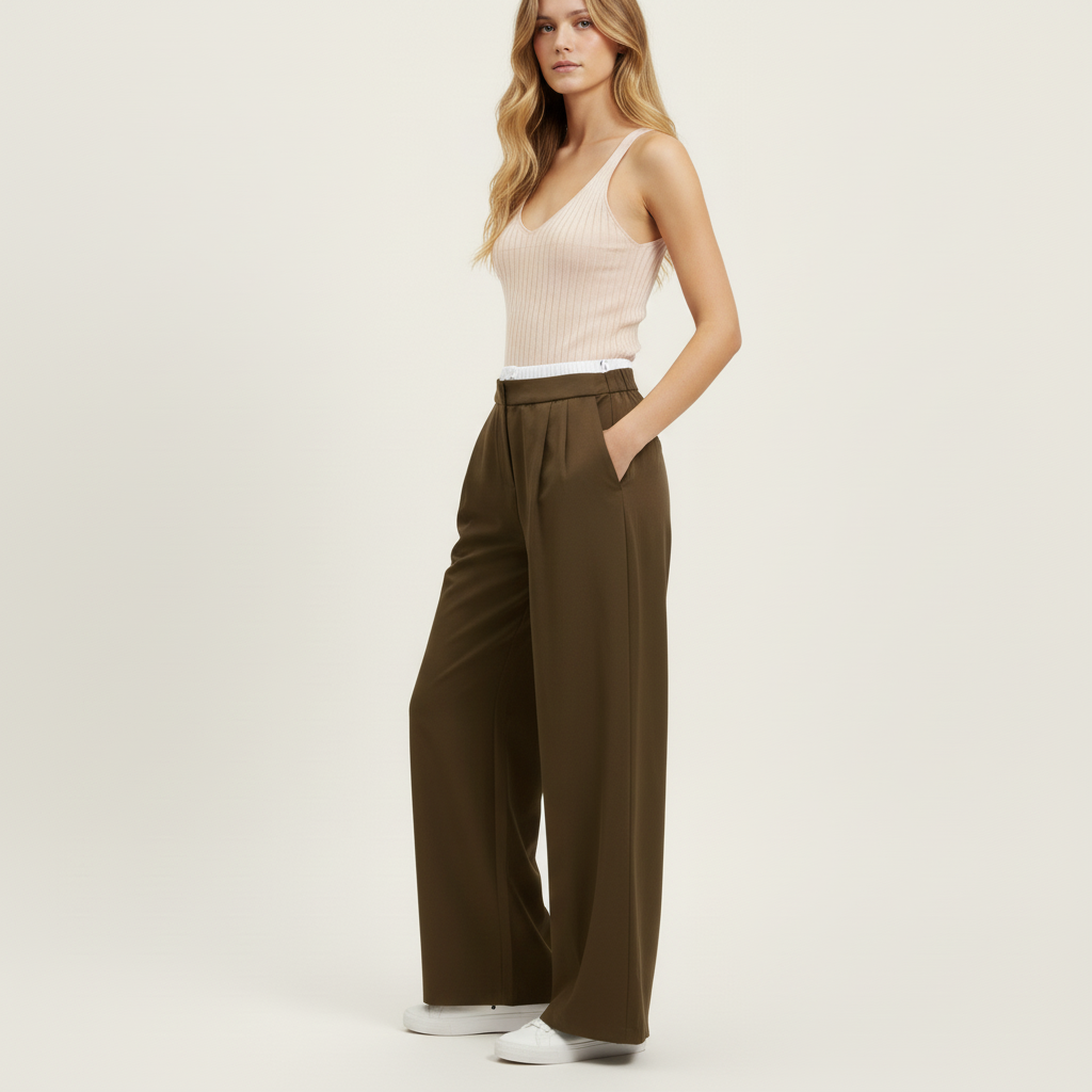 Pantalón marrón de pata ancha Ikio con pinzas, doble cintura y goma en la cintura superior de color blanco, cremallera escondida en el lateral izquierdo y dos bolsillos .