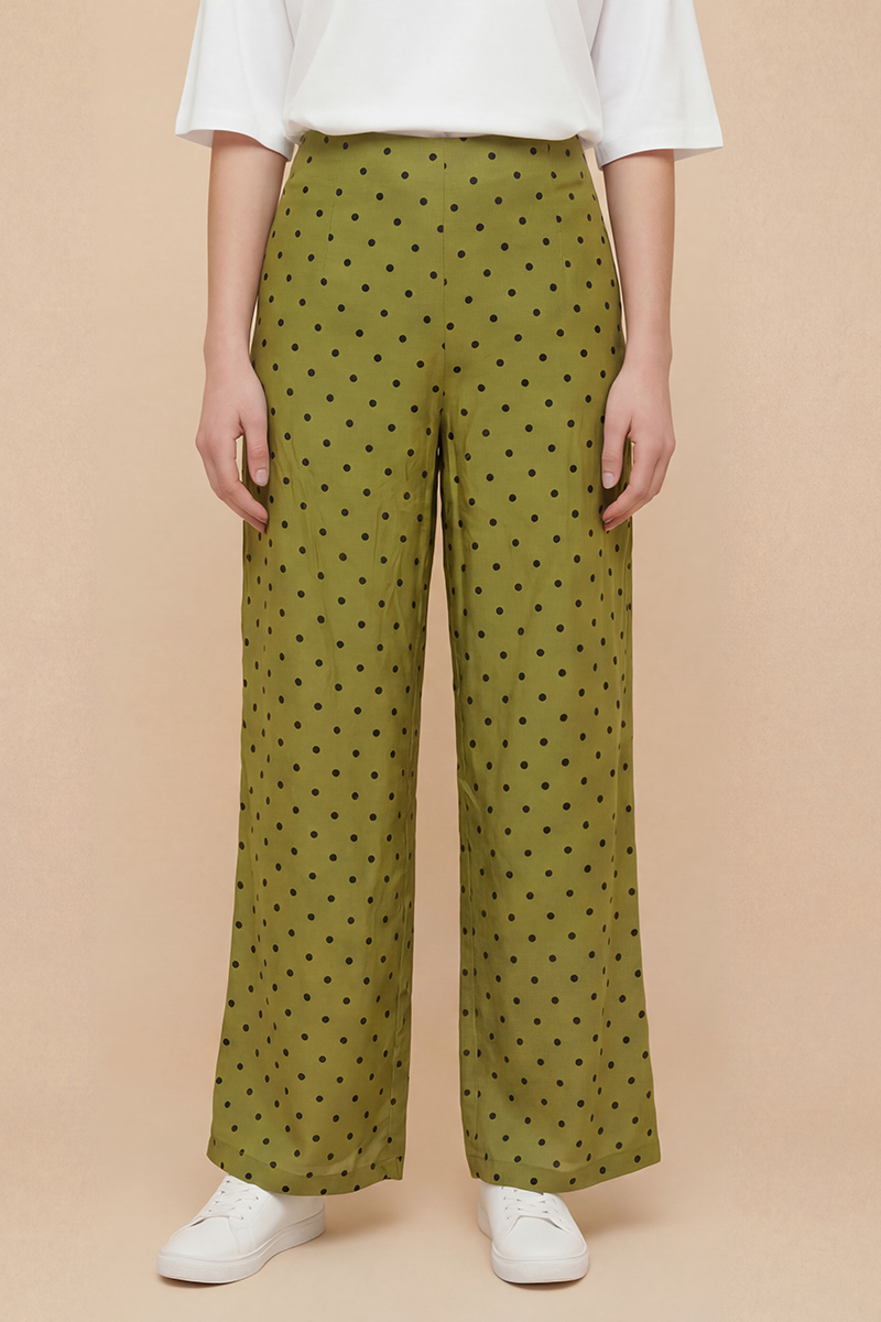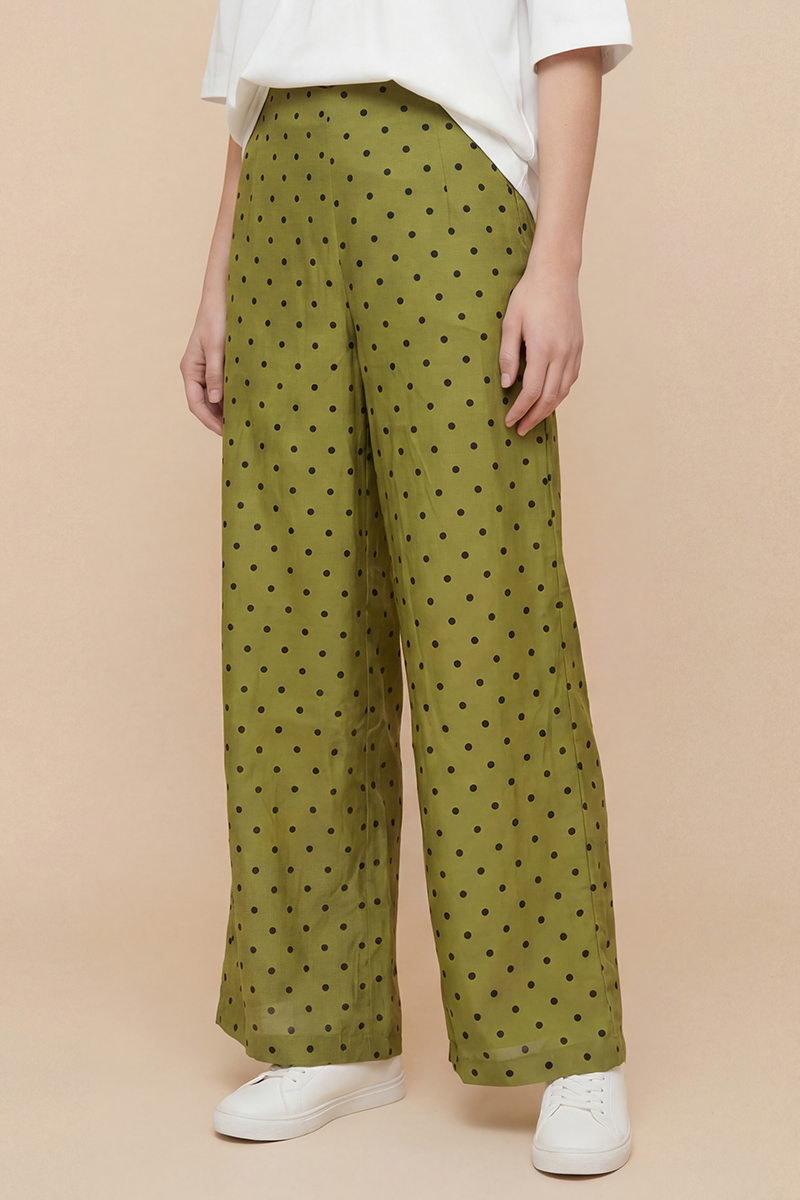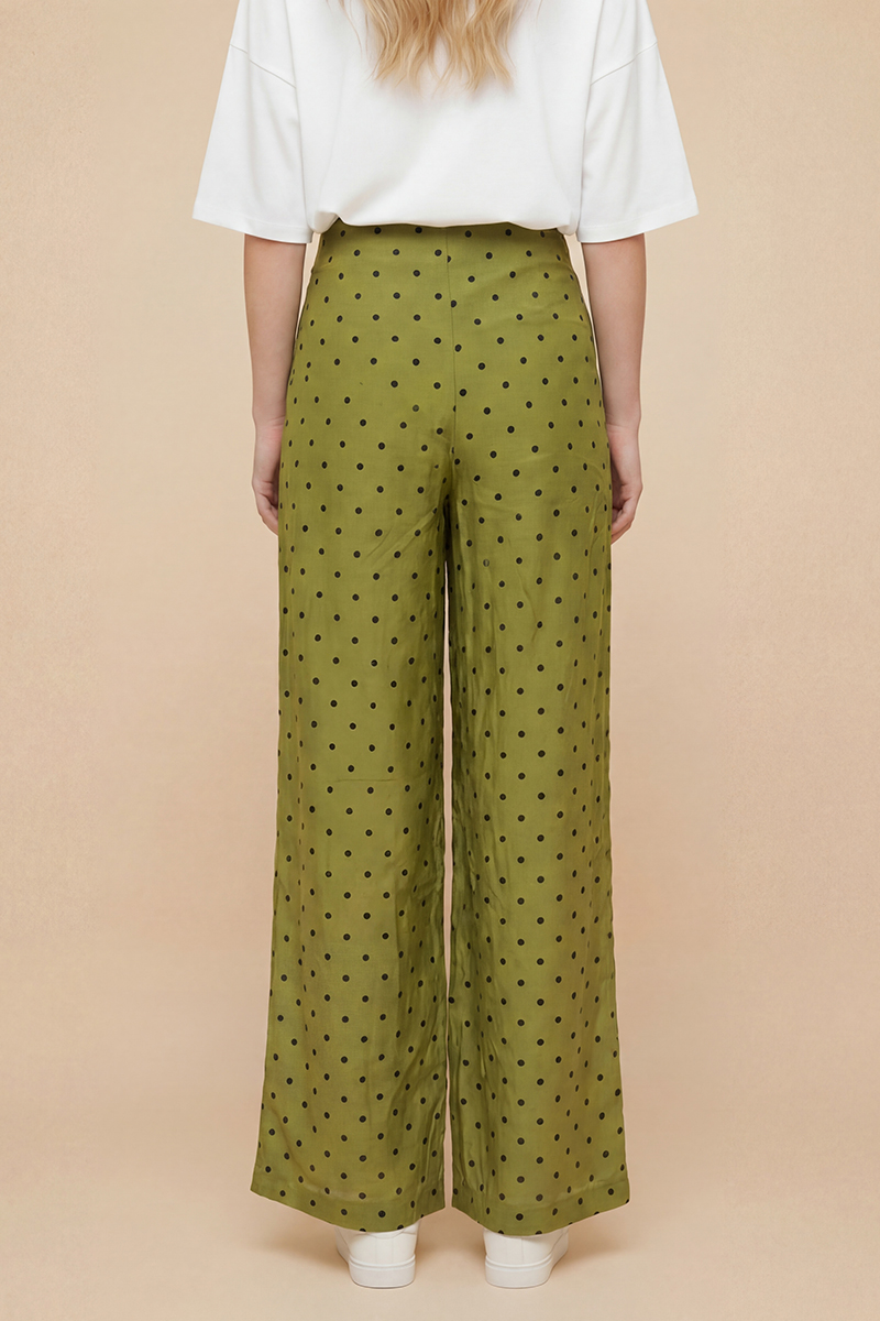 Pantalón verde de lunares Balmudo de pata ancha, largo, sin bolsillos y con cierre de cremallera integrado en la costura lateral izquierda. Composición: 90% viscosa y 10% poliéster. Forro: 100% viscosa.