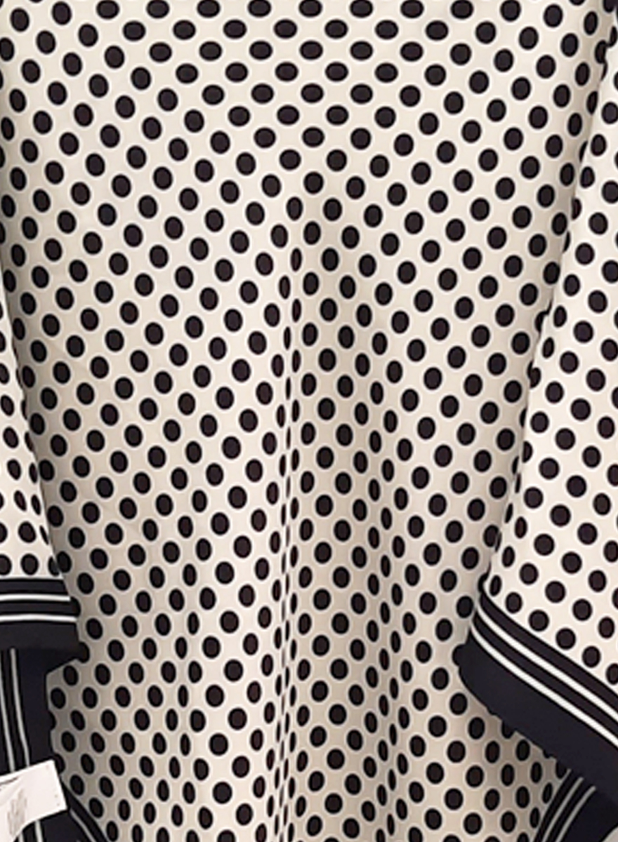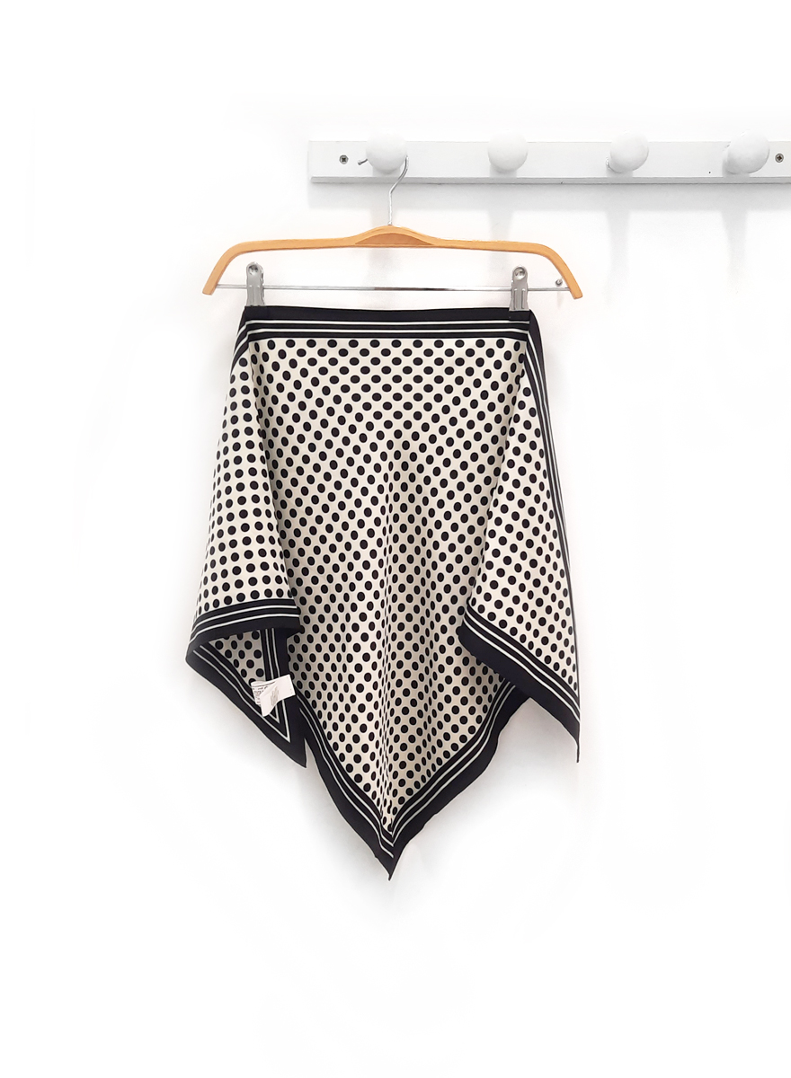 Pañuelo de lunares Mistral en tono crudo con lunares negros, ribete de líneas y con forma triangular. Composición: 100% poliester.