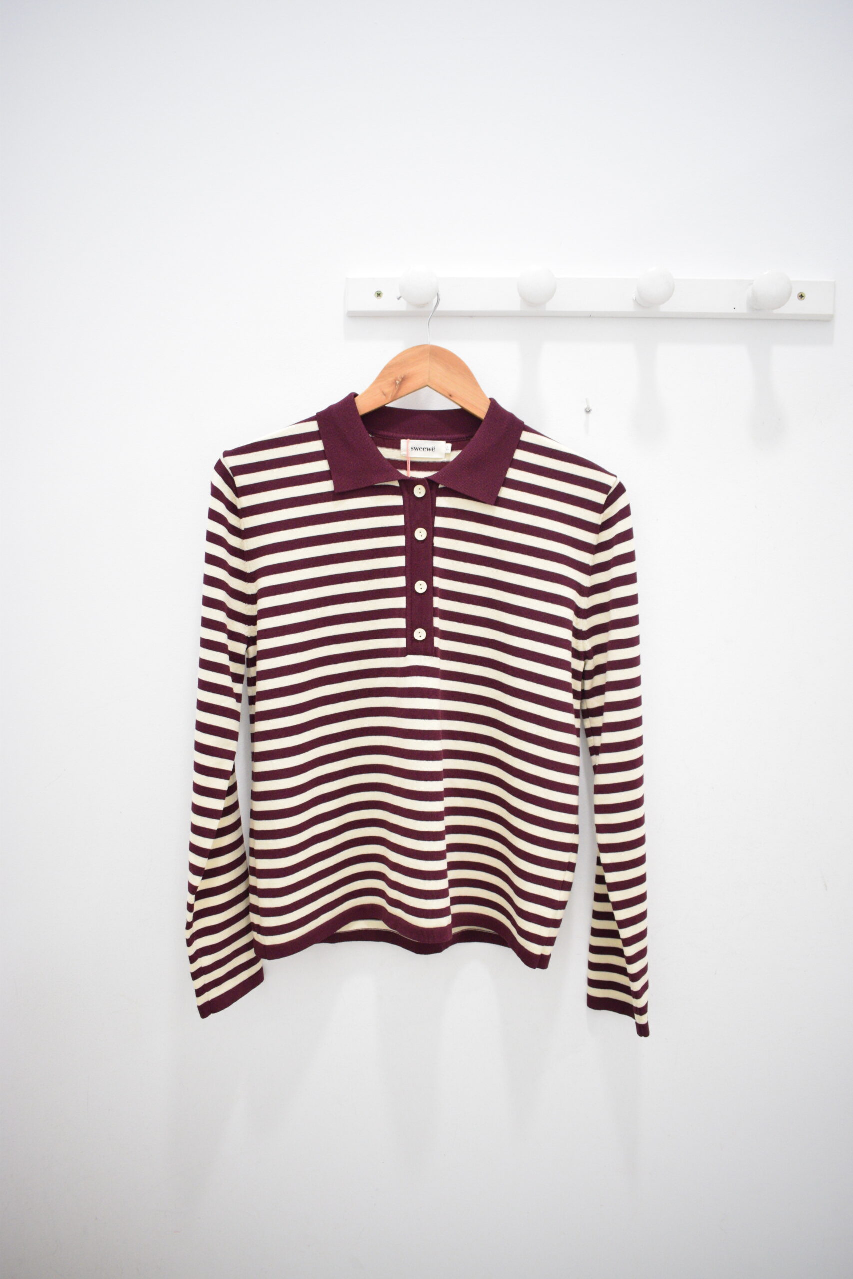 Polo granate de rayas beiges con el cuello granate + botonadura en crema.