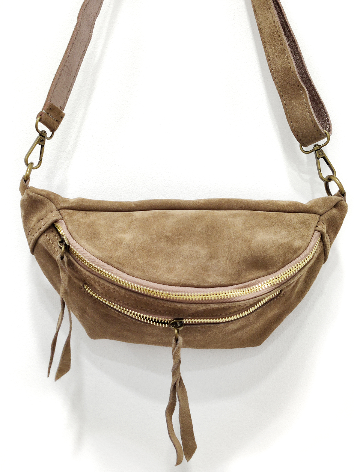 Riñonera color taupe Banzai de piel. Bolsillo delantero e interior ambos con cremalleras. Correa ajustable.