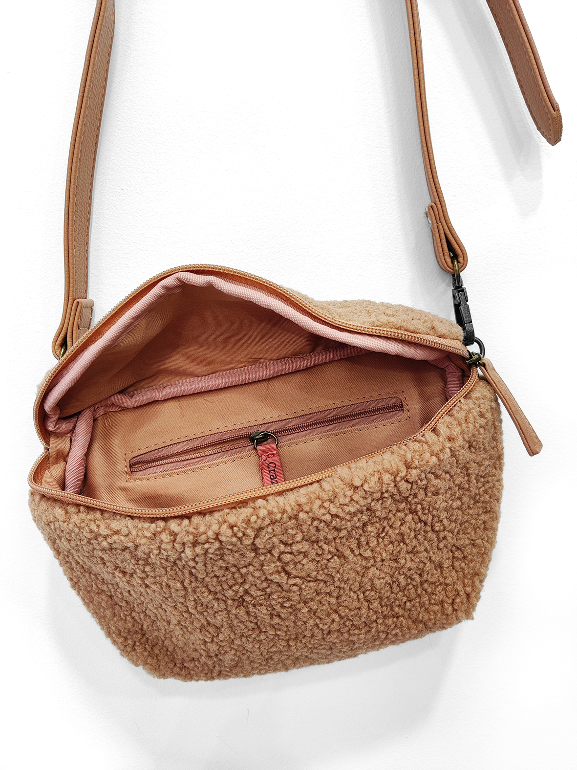 Riñonera color camel Lamb con correa ajustable. Tiene un bolsillo en la parte trasera y en el interior, ambos con cremallera y un apartado a modo de tarjetero.
