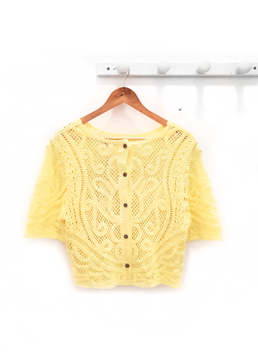Top amarillo Charlie calado de manga media con amplio escote redondo y botonera trasera.