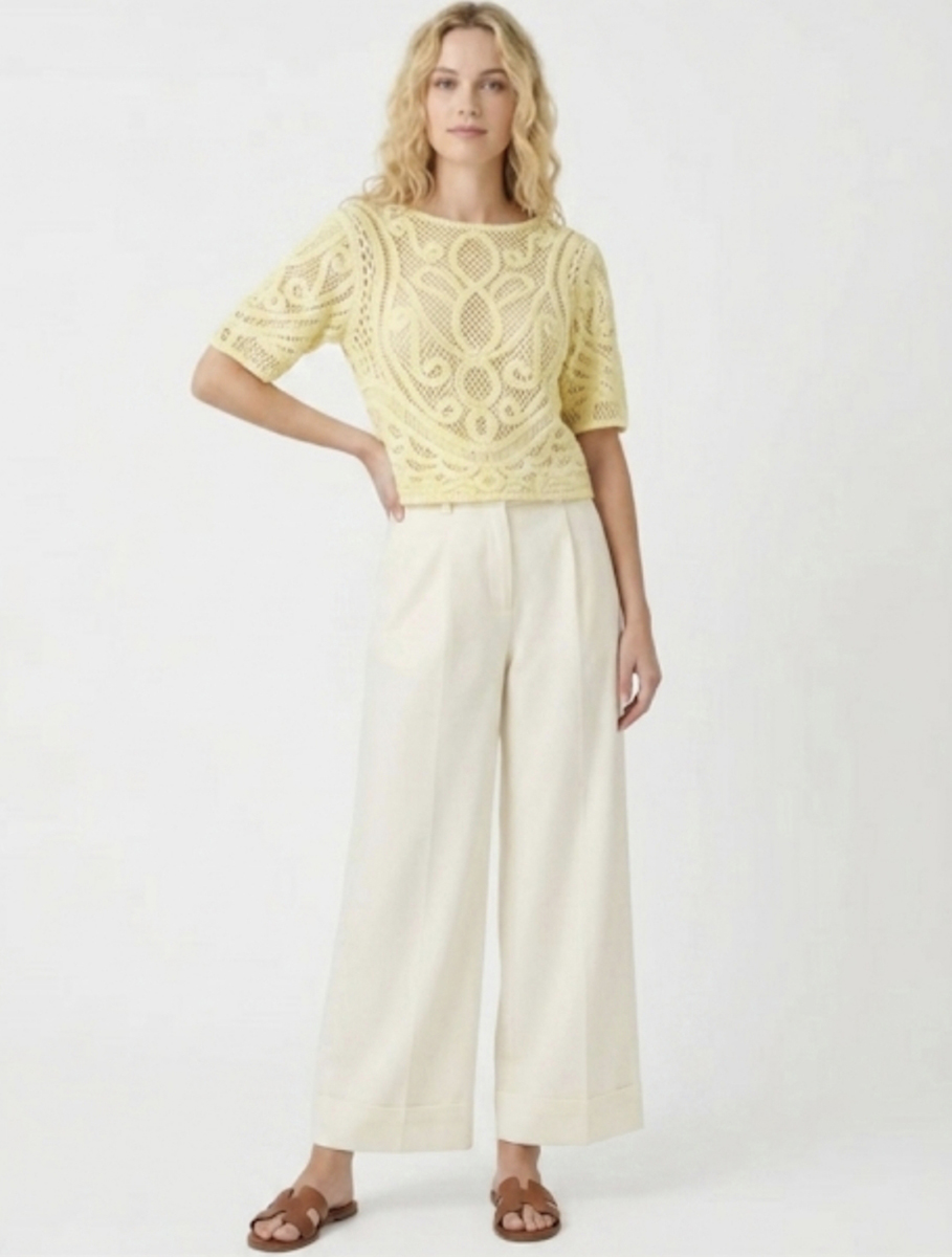 Top amarillo Charlie calado de manga media con amplio escote redondo y botonera trasera. Composición: 100% algodón.