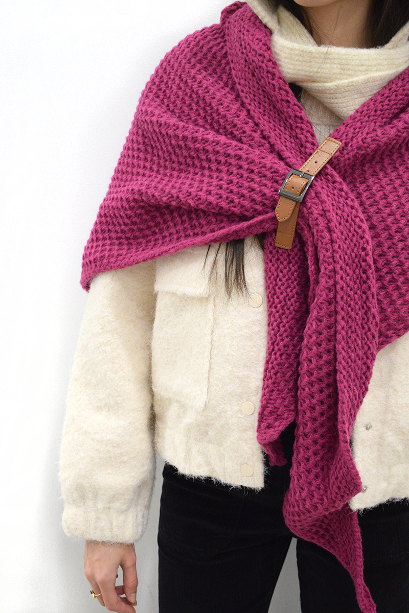 Toquilla violeta Amona de punto y con hebilla metálica sobre zona de piel marrón cercana a a uno de los extremos para mejor sujección.