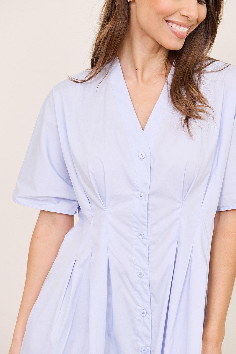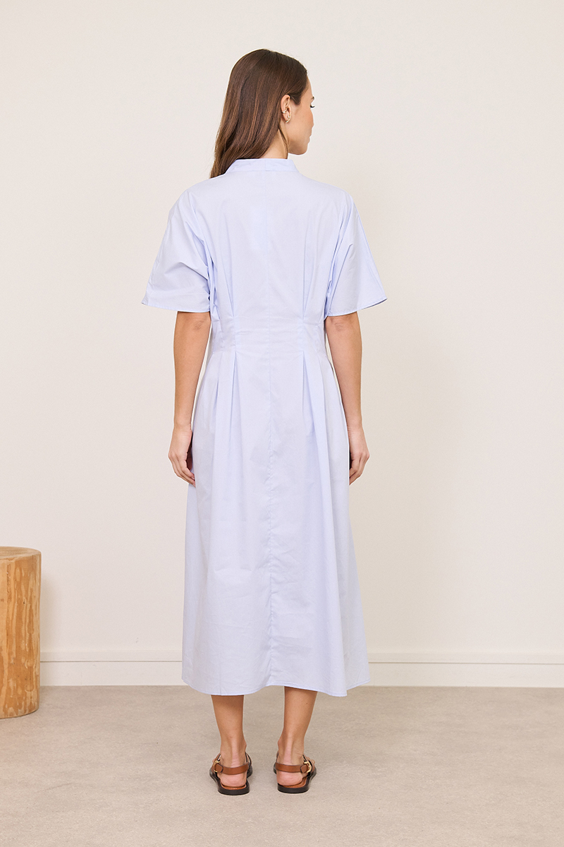 Vestido azul Maite de manga corta con bolsillos verticales, abotonado hasta abajo, con cuello en pico y pinzas en la cintura. Composición: 100% algodón.