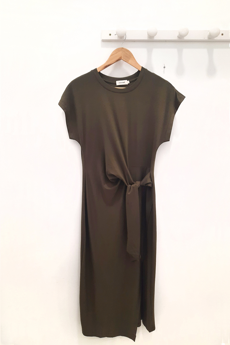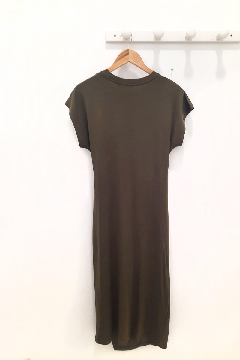 Vestido caqui Denis de manga corta, tejido ligero, detalle de fruncido con lazada en el costado izquierdo y abertura lateral en la falda.