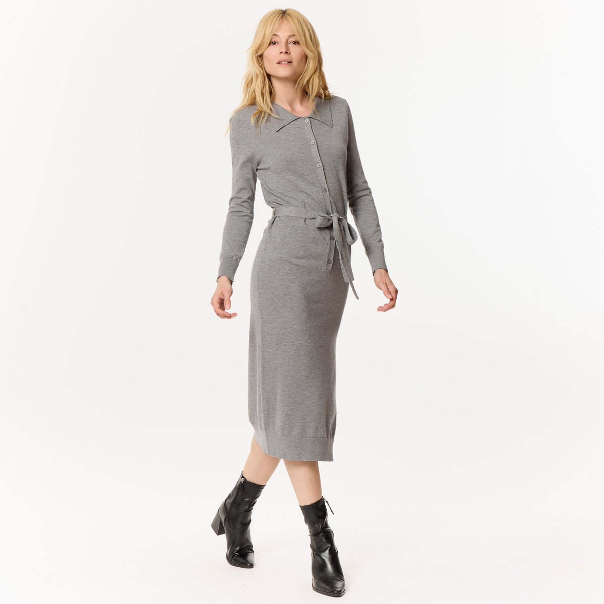 Vestido de punto gris Mera de largura media, con trabillas laterales y cinturón del mismo tejido, botonadura gris hasta la cadera, puños elásticos, cuello polo y abertura en el lateral inferior izquierdo.