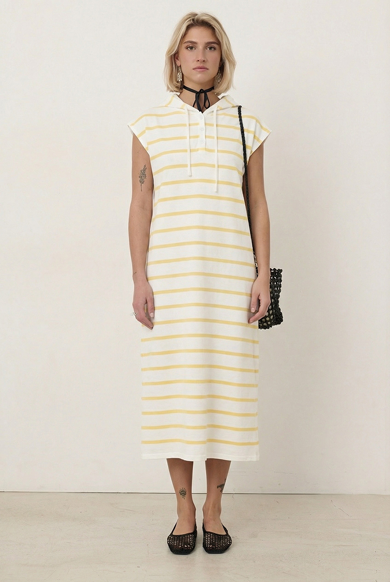 Vestido de rayas amarillas Santi largo, con con botones blancos, capucha blanca ajustable con cordoncillo y de tejido fresquito ideal para la playa. Composición: 65% viscosa y 35% nylon.
