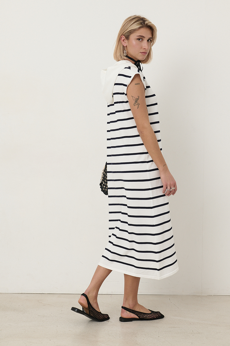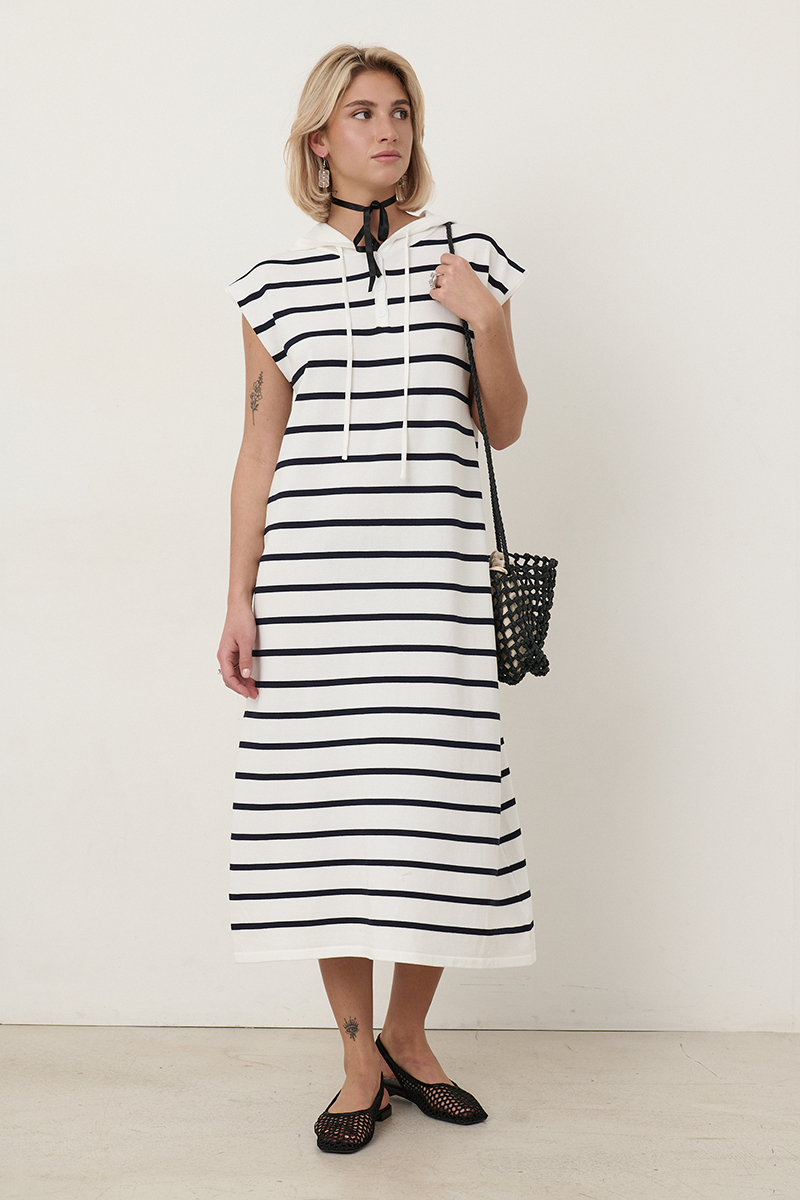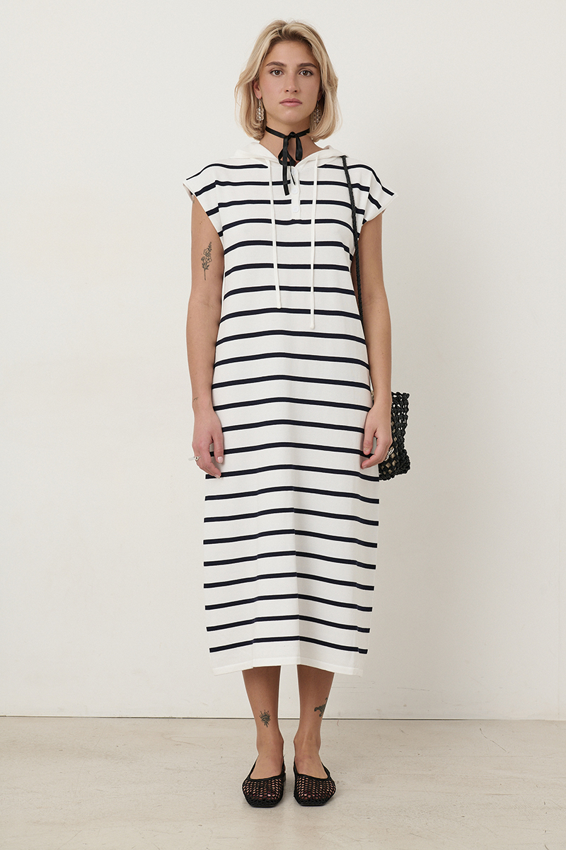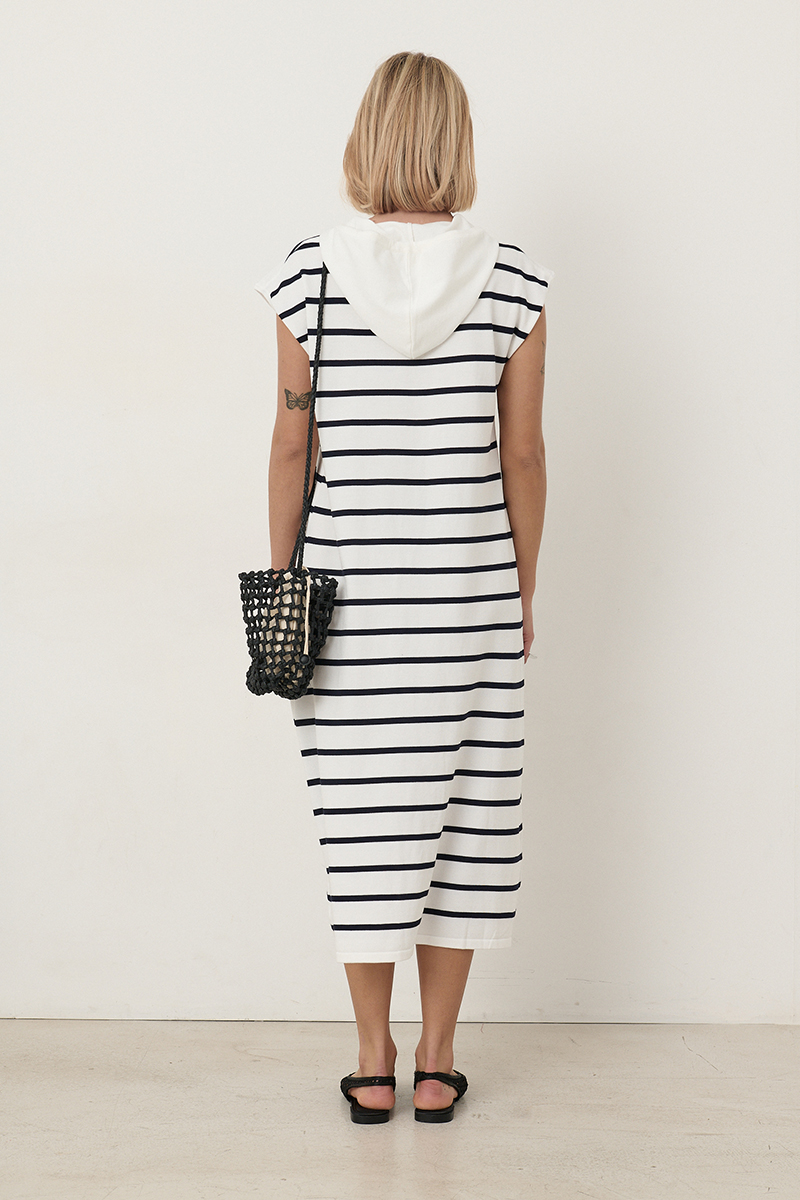 Vestido de rayas azul marino Santi largo, con con botones blancos, capucha blanca ajustable con cordoncillo y de tejido fresquito ideal para la playa. Composición: 65% viscosa y 35% nylon.