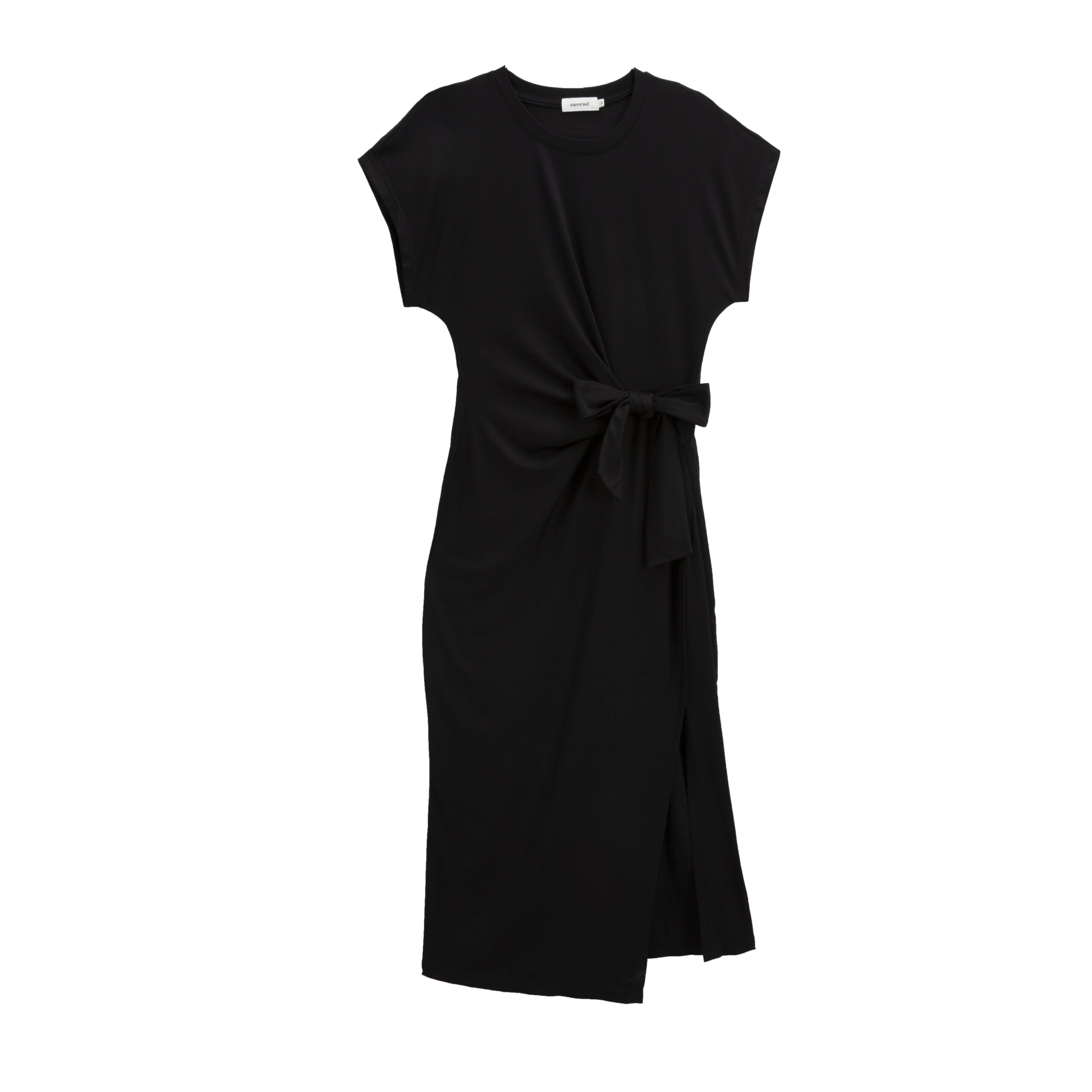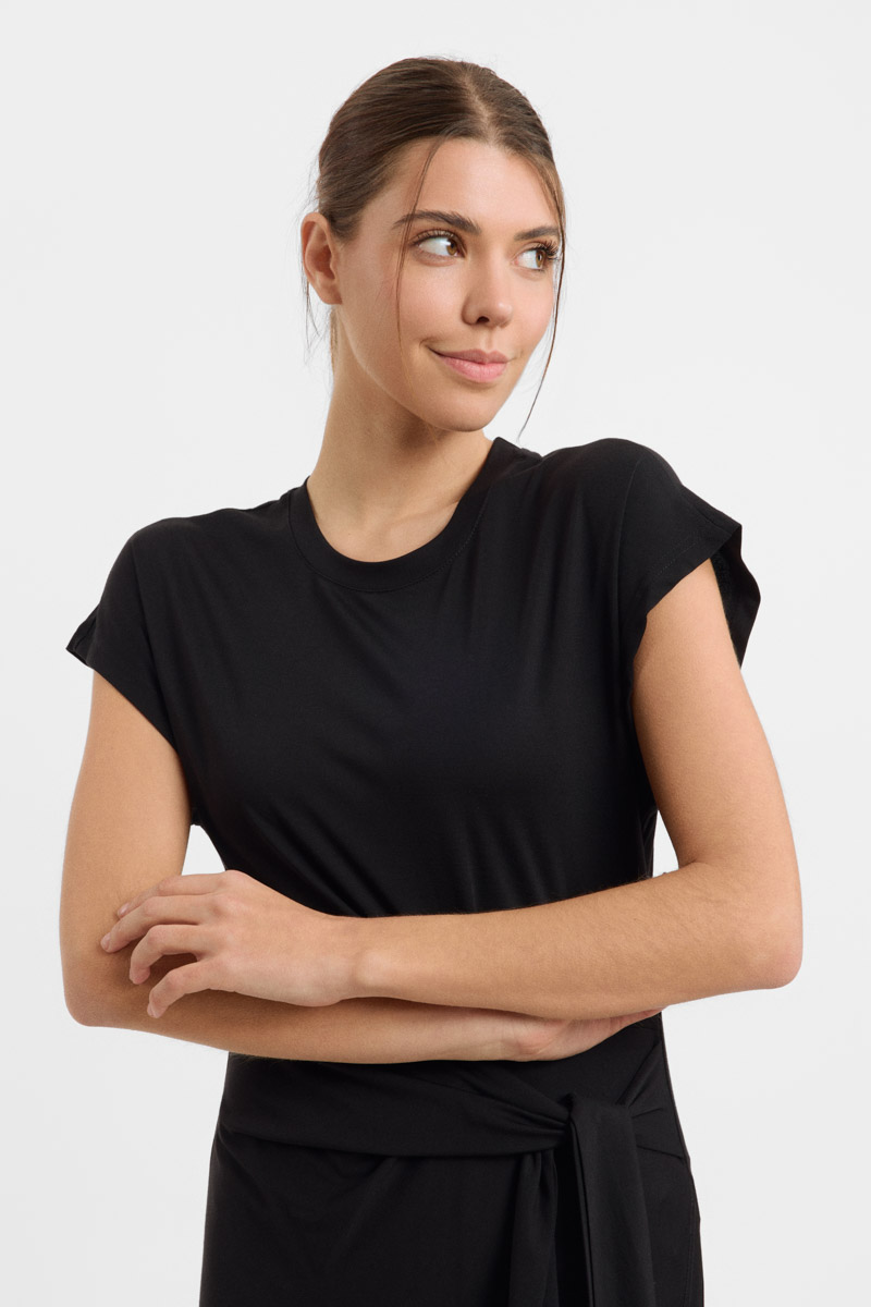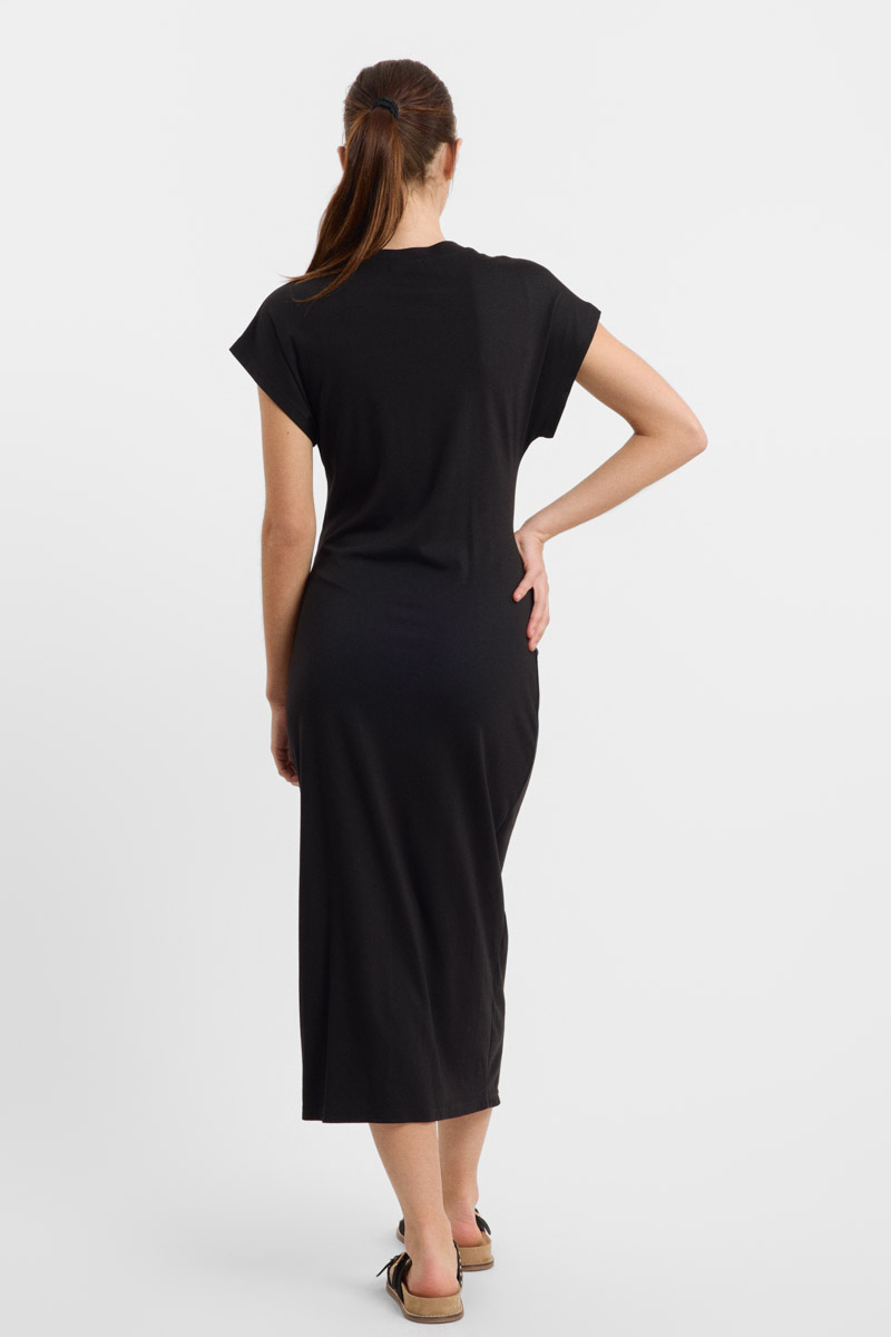 Vestido largo negro Denis de escote redondo, manga corta, abertura lateral por encima de la rodilla y lazada en la cintura.