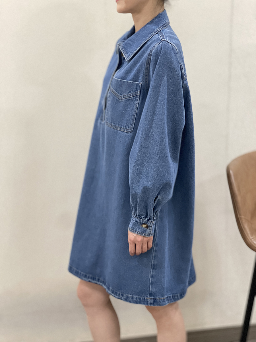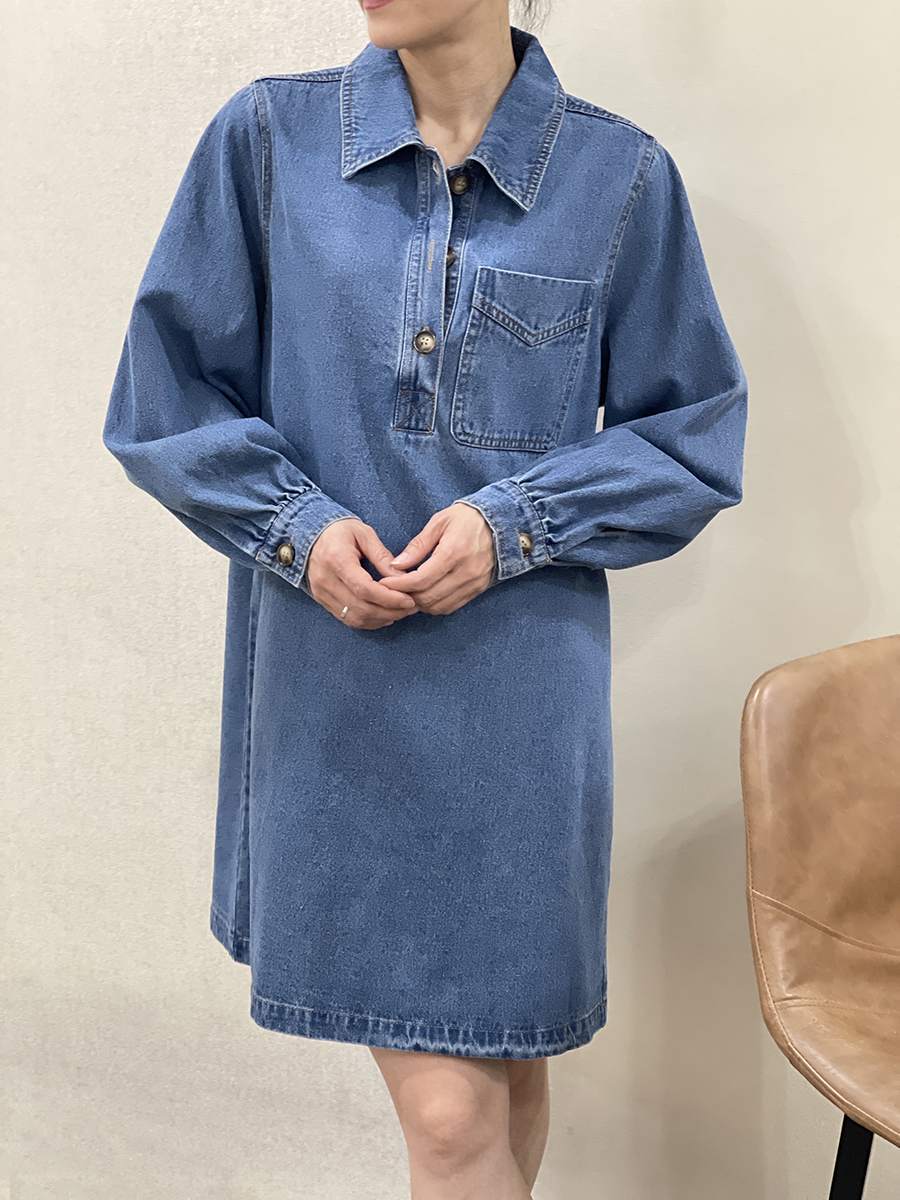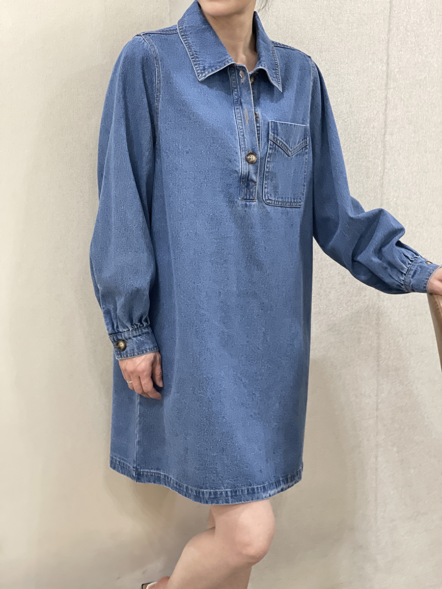 Vestido vaquero Curtis de largura media con cuello de solapas, abertura vertical en el pecho con botonera, bolsillo frontal en el lado izquierdo, puños con botón y detalle fruncido en la espalda.