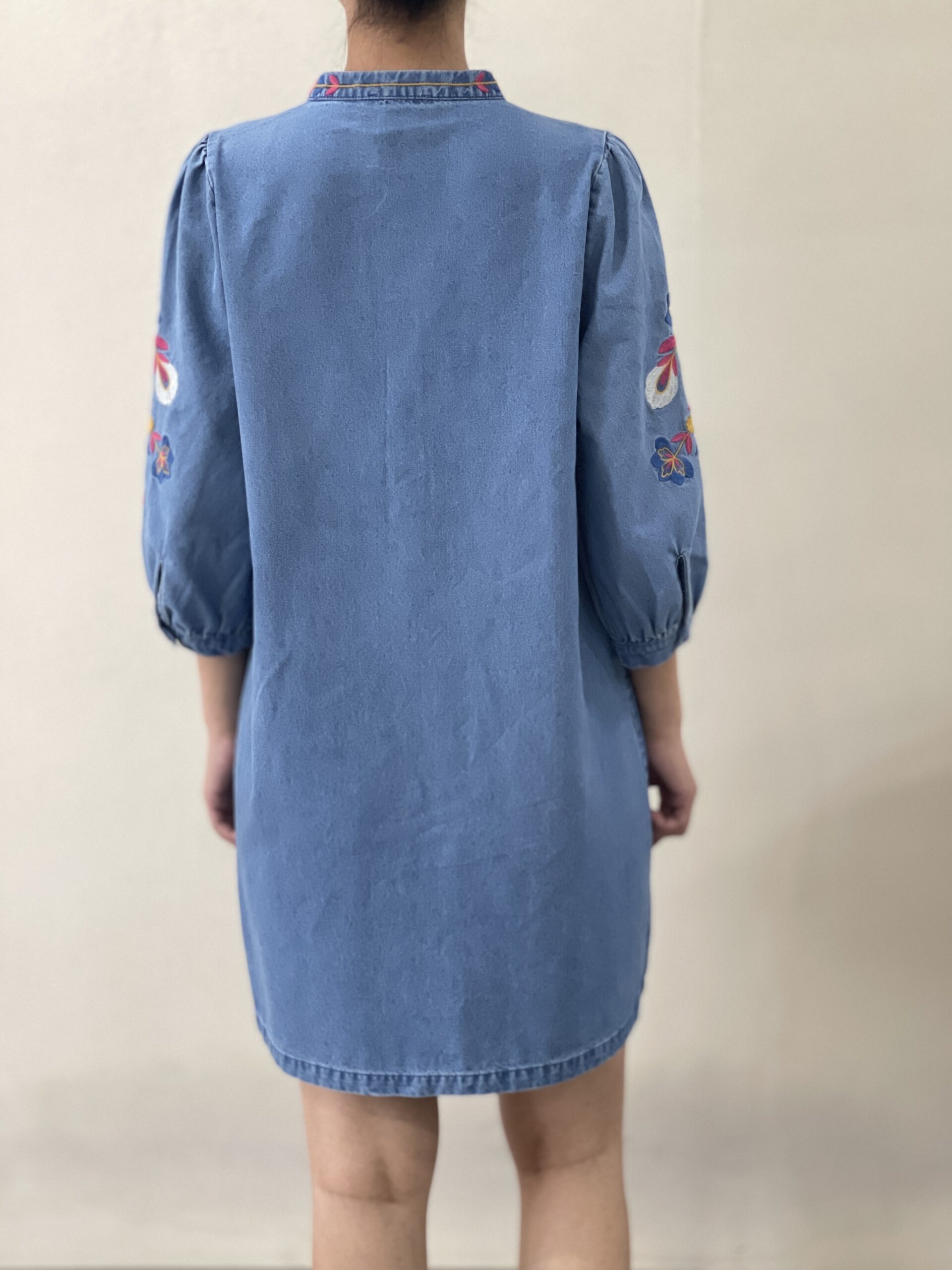 Vestido vaquero Pascal de largura media con cuello redondo, abertura vertical en el pecho, fruncido en los hombros, puños con botón y bordado de flores en mangas y ribetes del cuello y el pecho.
