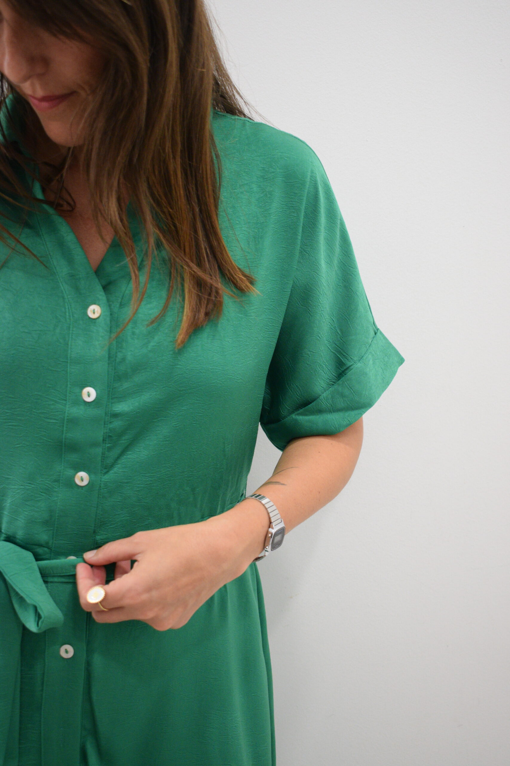 Vestido verde Ioritz de largura media, manga corta con vuelta, cuello en pico con solapas, botones nacarados hasta el pecho y cinturón del mismo tejido.