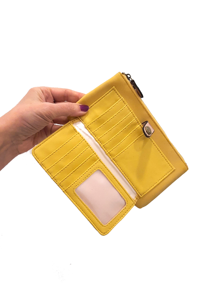 Cartera amarilla Ecuador con diez departamentos para tarjetas y uno transparente para DNI, pequeña billetera y tira efecto gliter con cierre de clic. Departamento con cremallera para monedas con otro interior también con cremallera. Forro interior en color carne.