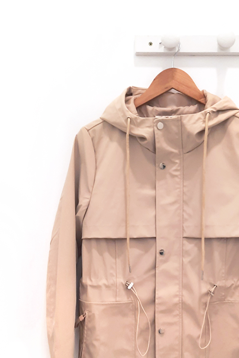 Chubasquero beige Kazkabar de largura media con capucha ajustable, cierre de cremallera + botonadura de clicks, bolsillos laterales y cintura elástica con goma ajustable. Tejido impermeable y cortavientos.