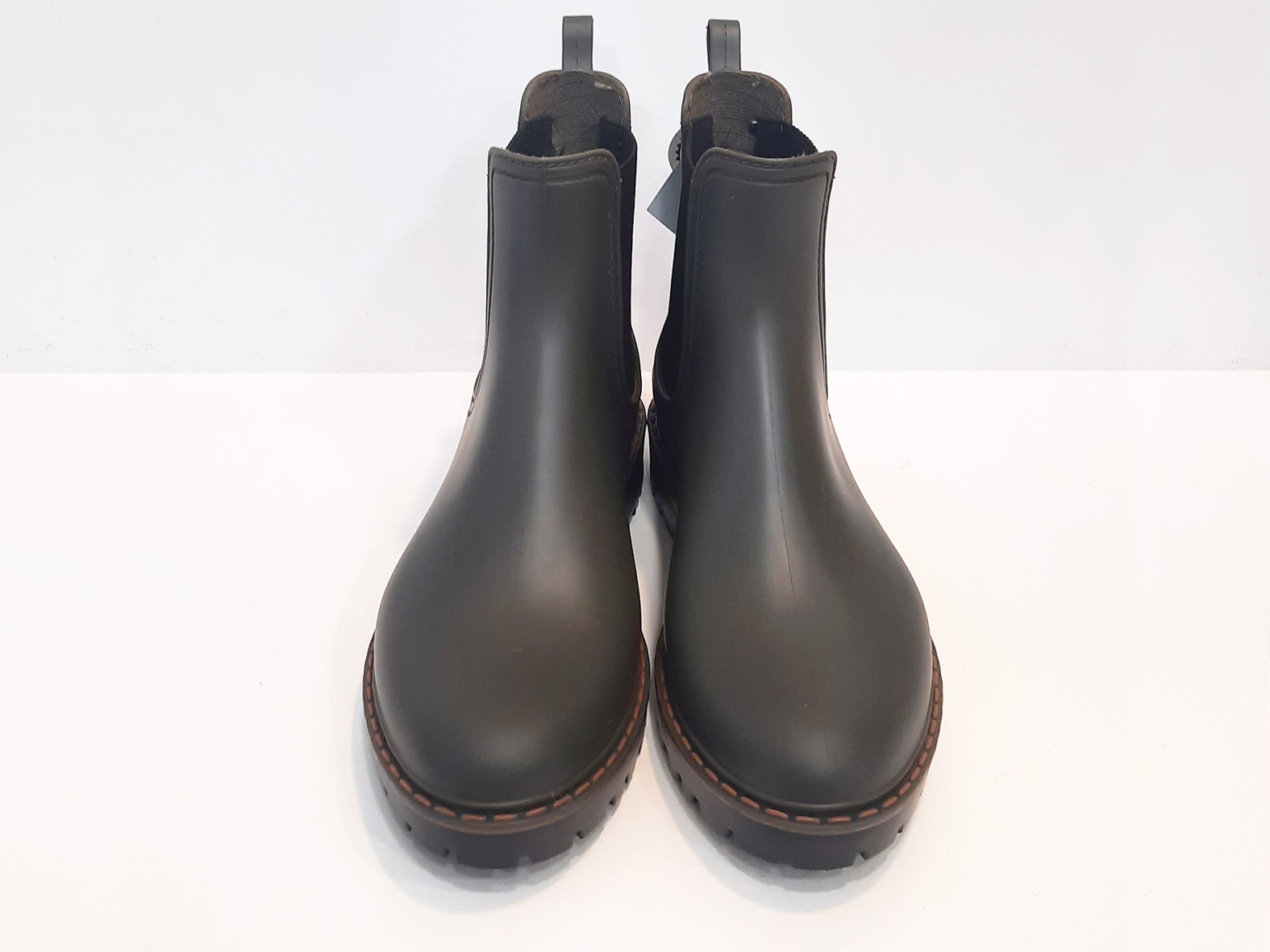Katiuska caqui Igor tipo bota de agua con zona elástica de color negro en los tobillos para facilitar la entrada y salida del pie. Suela de goma antideslizante en color negro con pespunte marrón claro.