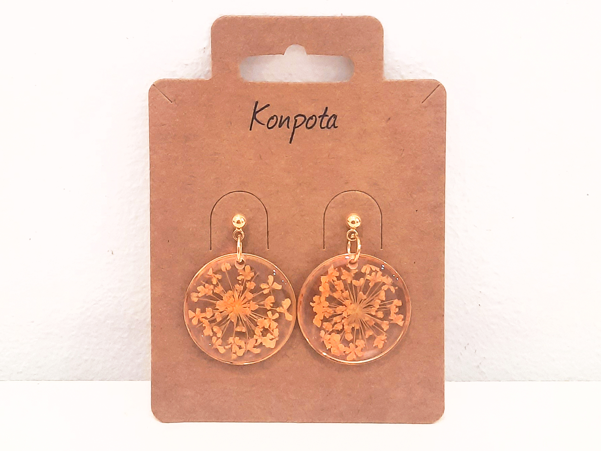 Pendientes Heliance redondos en forma de aro dorado que contiene resina con una delicada flor en tono naranja.