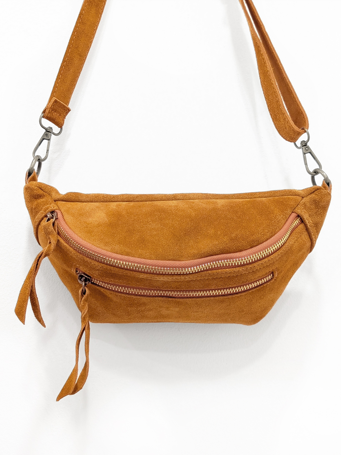 Riñonera color camel Banzai de piel. Bolsillo delantero e interior ambos con cremalleras. Correa ajustable.