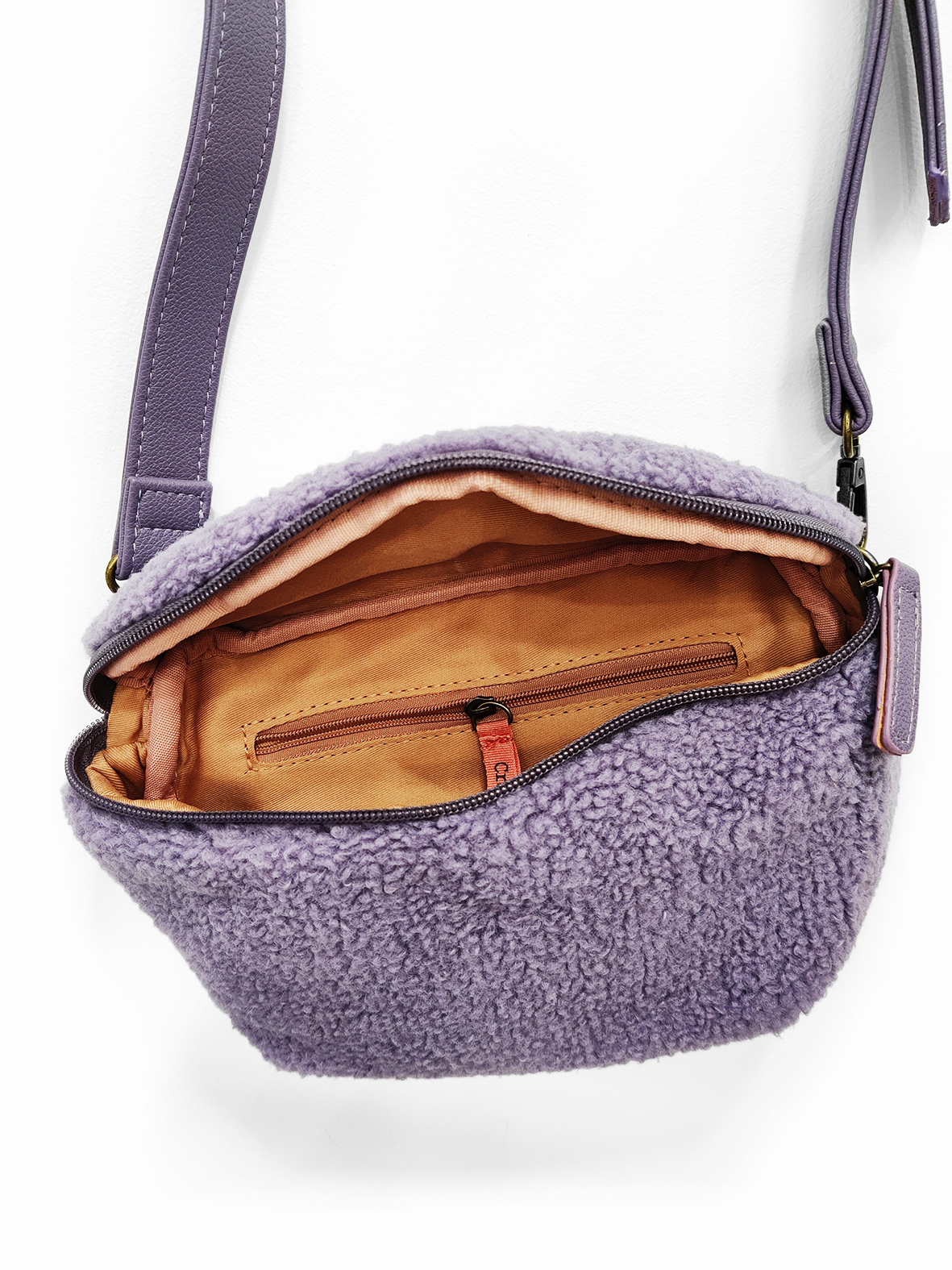 Riñonera color lila Lamb con correa ajustable. Tiene un bolsillo en la parte trasera y en el interior, ambos con cremallera y un apartado a modo de tarjetero.